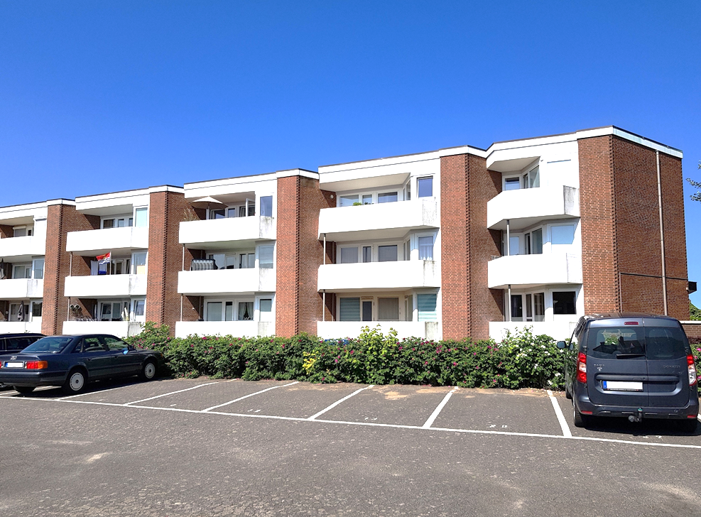 Es handelt sich um eine exklusive und sehr attraktive Wohnung in der 1964 in klassischer Massivbauweise errichteten Wohnanlage mit insgesamt 52 Einheiten. Die Fassade ist mit einem rötlich-braunen Klinker versehen. Die gesamte Anlage sowie die Außenanlagen sind in einem sehr gepflegten Zustand. Die angebotene Wohnung befindet sich im Hochparterre. Im Geschoss darunter befinden sich ebenfalls Wohnungen. Das Haus ist voll unterkellert. Darüber hinaus gibt es eine Garagenzeile und freie Pkw-Stellplätze.   DIE WOHNUNG Gleich beim Betreten dieser Wohnung wird klar, dass bei der Renovierung und Gestaltung mit viel Liebe zum Detail eine ausgesprochene Wohlfühlatmosphäre vorhanden ist. Die helle und freundliche, ca. 54 m² große Wohnung mit 2 Zimmern bietet ausreichend Platz für einen wunderschönen Aufenthalt auf der beliebten Insel Sylt.   Die Wohnung hat eine außergewöhnlich raffinierte Aufteilung. Vom Eingangsbereich/Flur gelangt man rechts in das helle Wohnzimmer. Auf der anderen Seite liegt das Schlafzimmer und in der Mitte ist das Bad mit Dusche und WC angeordnet. In die separate Küche gelangt man über das Wohnzimmer. Es wurden optisch sehr geschmackvoll im Wohn- und Schlafbereich Einbauschränke maßgefertigt.   Hervorzuheben ist der große nach Westen ausgerichtete und überdachte Balkon, der von beiden Zimmern zu erreichen ist. Hier können Sie die Abendsonne in vollen Zügen genießen.