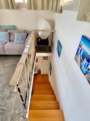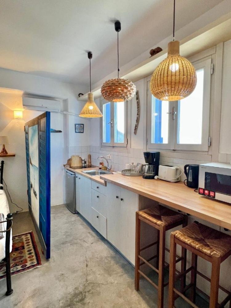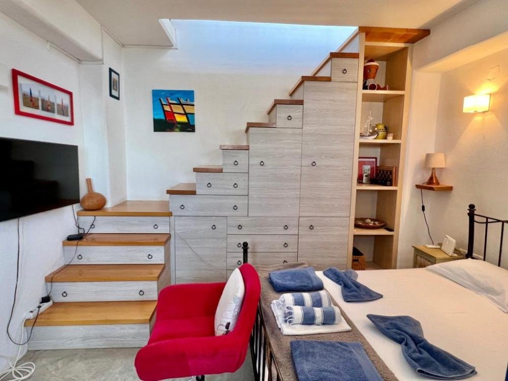 Heller, offener Küchen- und Schlafbereich mit Einbauschränken und Schubladen unter der Treppe und zwei großen Fenstern (zur Küchenseite) für viel Licht und einen herrlichen Meerblick.