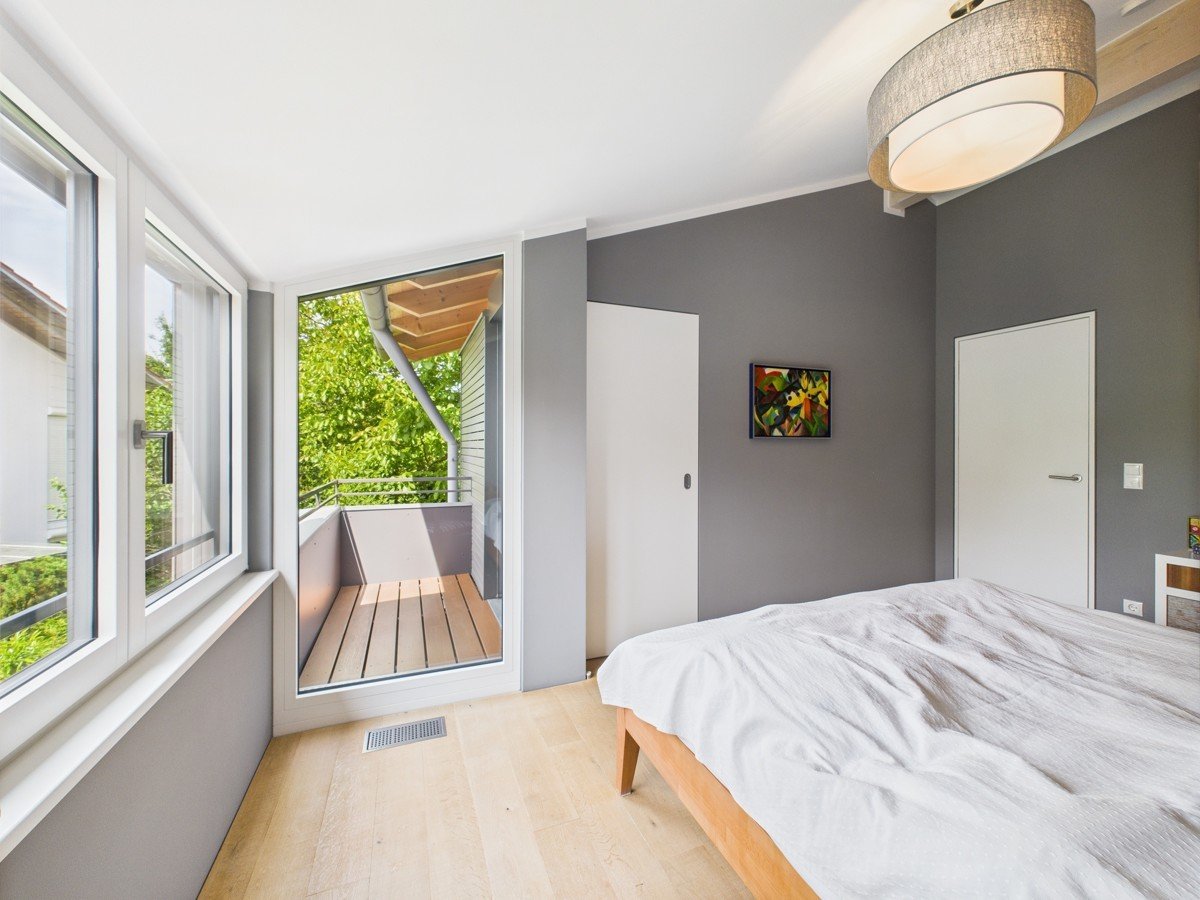 Das Haus beeindruckt mit einer attraktiven Ausstattung und einem durchdachten Raumkonzept. Im Obergeschoss finden Sie zwei Balkone, die an den Schlafzimmern angrenzen, sowie ein Elternschlafzimmer mit eigener Ankleide. Die Wohnräume sind durch großzügige Fensterfronten lichtdurchflutet, während der offene Wohn- und Essbereich mit einer hochwertigen Schreiner-Einbauküche und Geräten von Miele besticht. Ein moderner Kaminofen sorgt für behagliche Wärme.