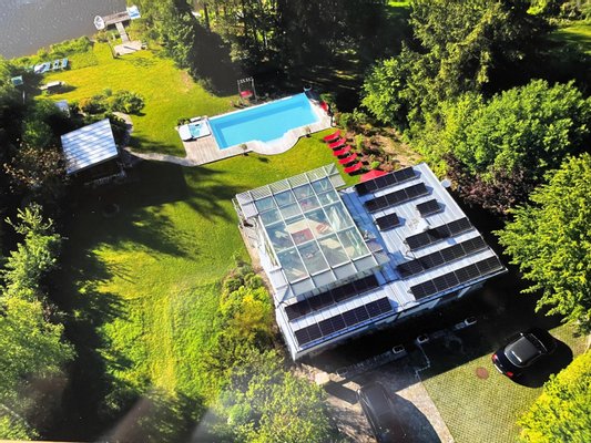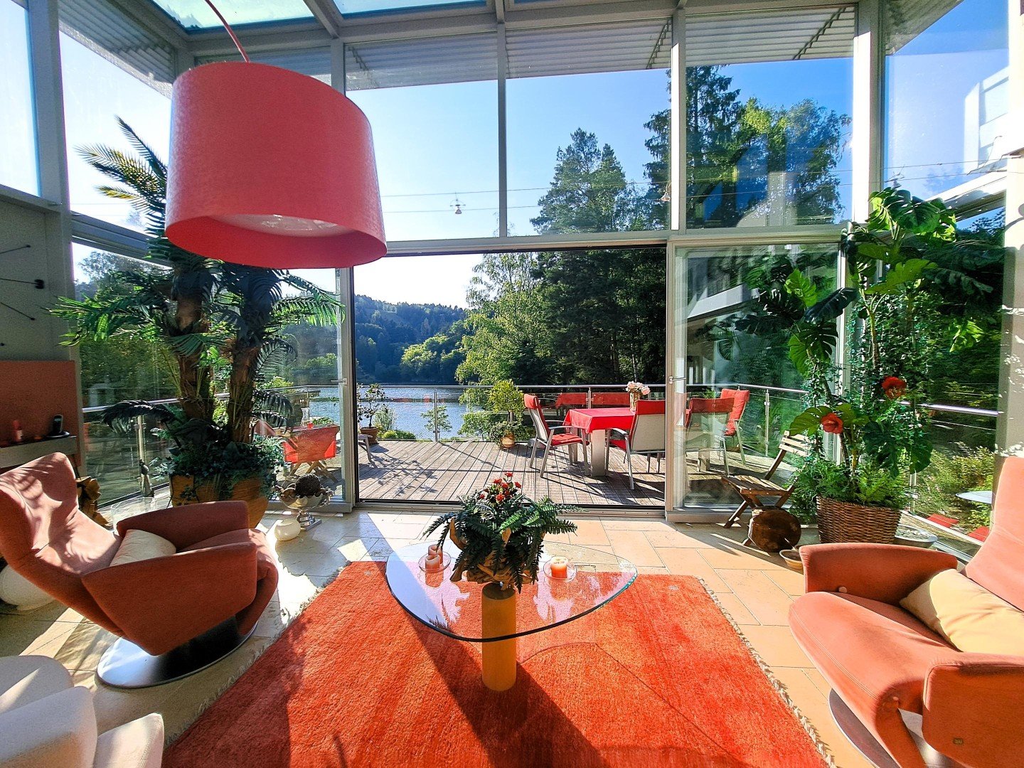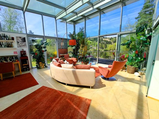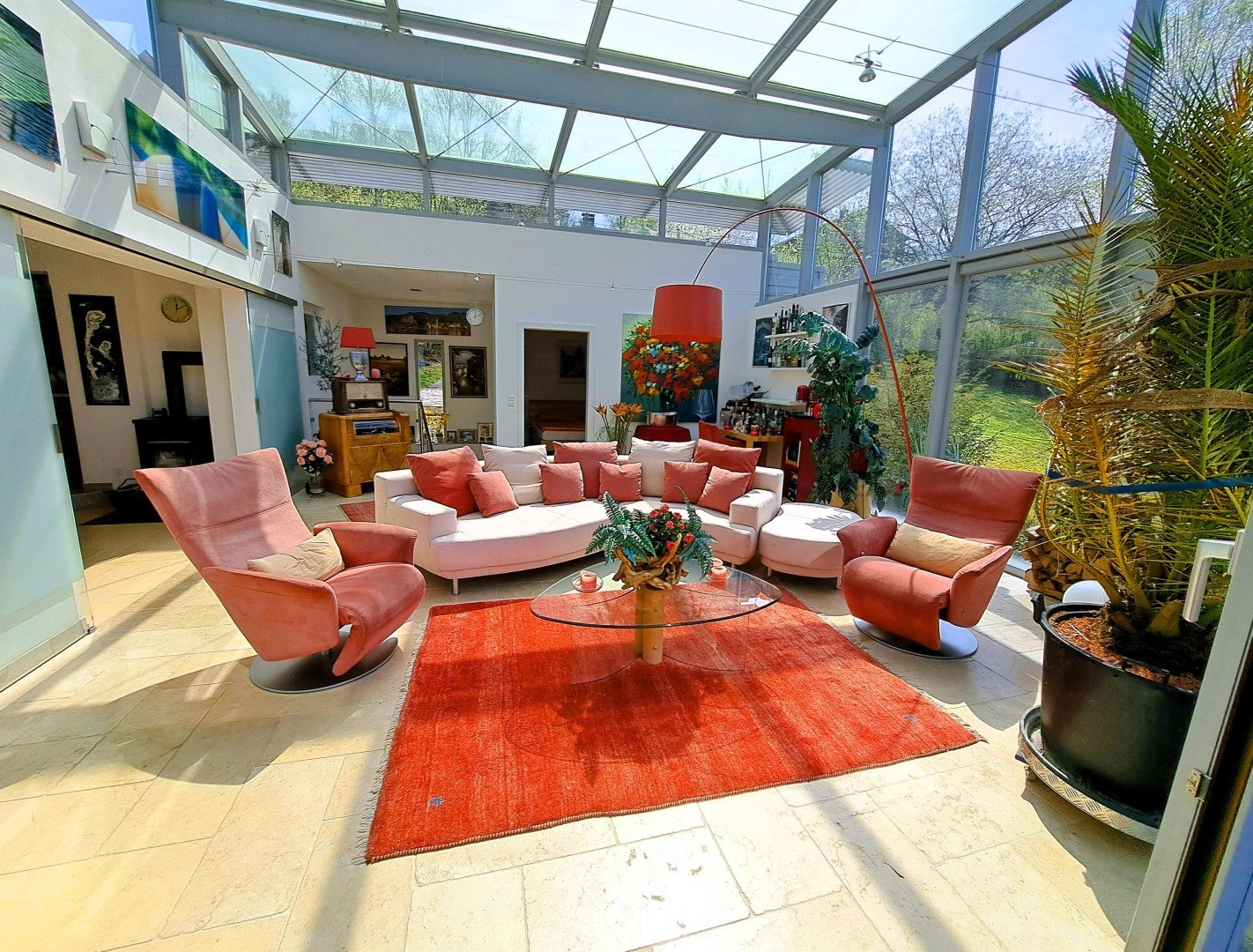 * ein ca. 45 m² großer und 4,5 m hoher Wohnglas-Salon mit 2 Glasseiten und Glasdach - daran angeschlossen