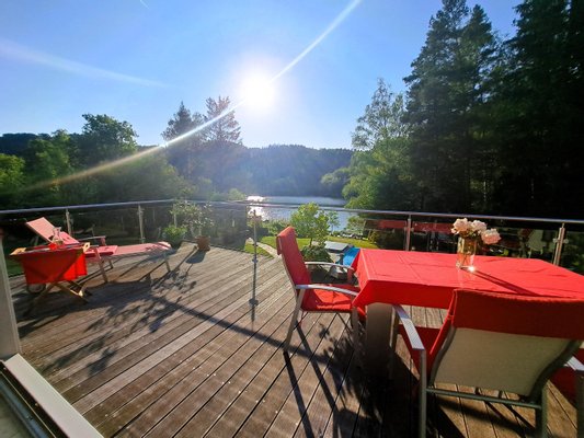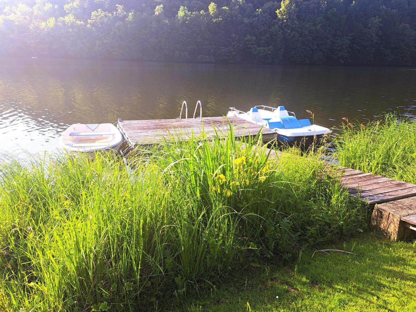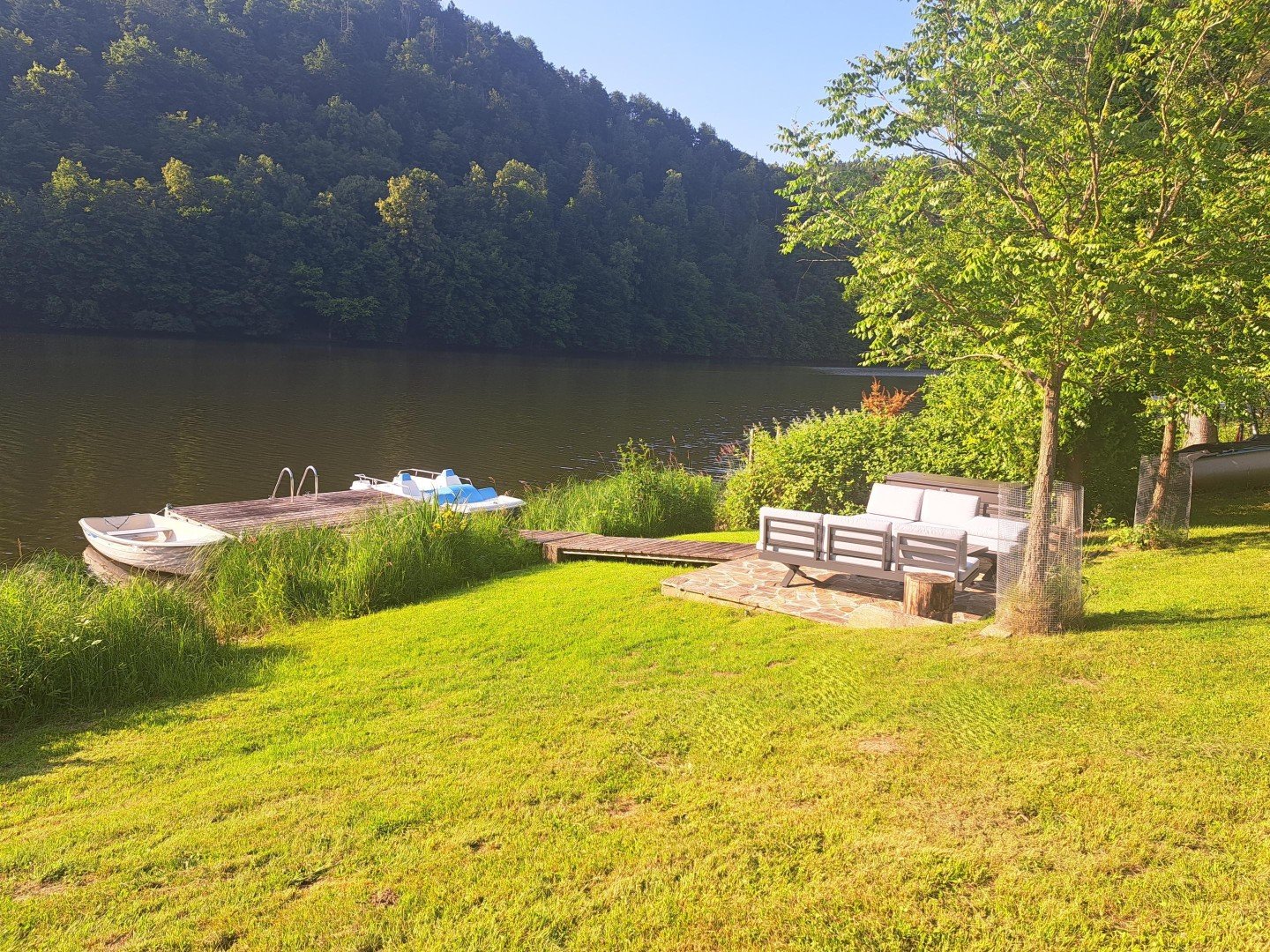 8. Als besonderes Highlight zeigt sich der SEELIEGEPLATZ; ein direkt beim Seeufer gemauerter Sonnenliegeplatz mit Mobilar und Bade- bzw. Bootssteg. Ruder- und Tretboot sowie ein Stand-Up-Paddelbrett liegen einsatzbereit vor Ort.