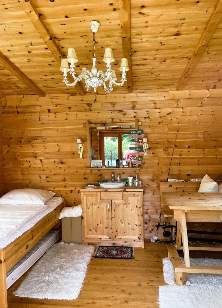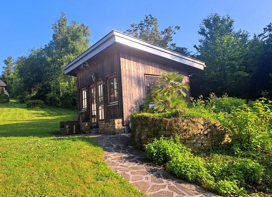 3. Der MUSENTEMPEL à la Gustav Mahler, ein ca. 12 m² großes innen komplett mit Zirbenholz ausgestattetes Holzhaus, ziert die östliche Grundstücksfläche nahe dem Seeufer.