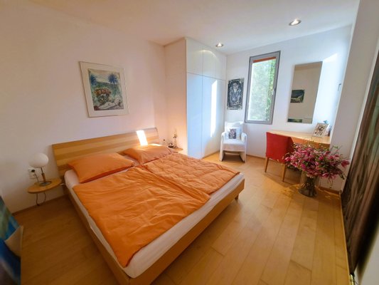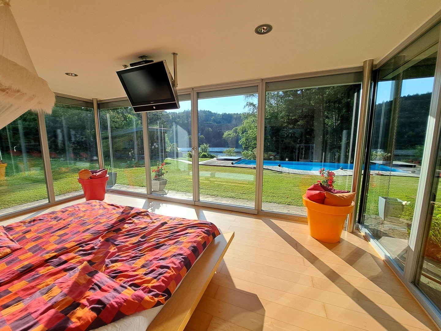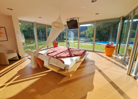 * ein großes Schlafzimmer mit direktem Ausblick zum Garten und See mit 3 Glasseiten und elektrisch bedienbaren Rollläden
