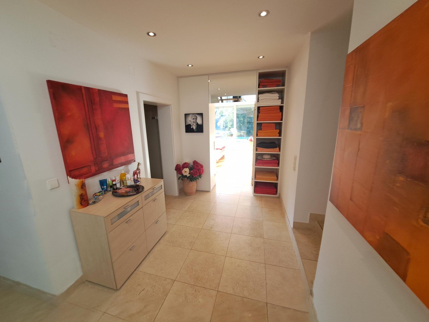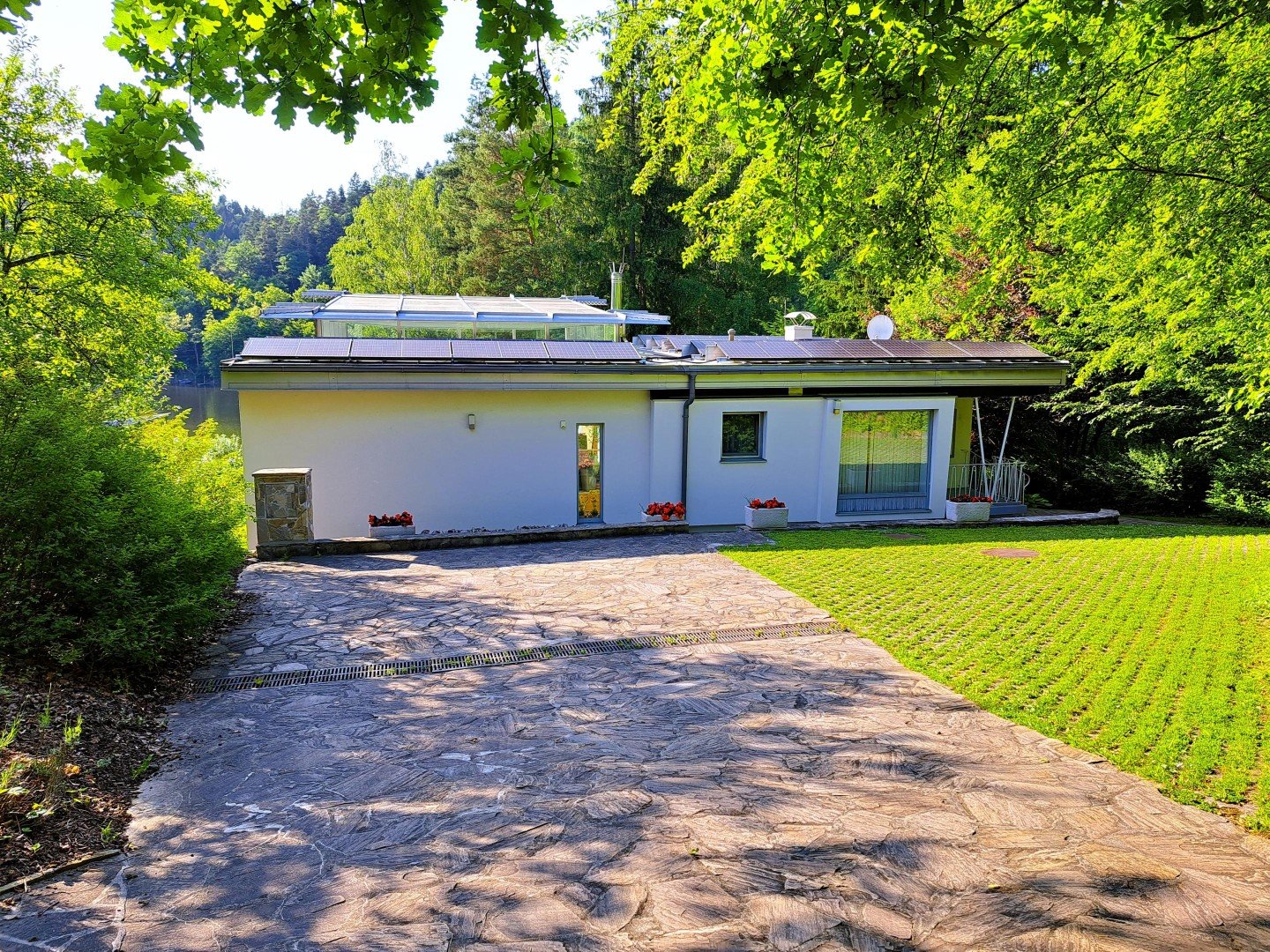 6. Die 8,2 kWp PHOTOVOLTAIK-Anlage und moderne TECHNIK versprechen Bequemlichkeit, Verlässlichkeit und Ressourcenschonung. In einem eigenen Technik- und Wirtschaftsraum werden die technischen Einrichtungen, die Elektrik inkl. Busschaltung, die ERDWÄRME-HEIZUNGSANLAGE für Fußboden-, Wand-, Radiatoren-, Pool- und Dachrinnenheizung, die Photovoltaik, die Autostromanlage und der Warmwasserpufferspeicher gemanagt. Auch Waschmaschine, Trockner, Bügelbrett und ein großer Gefrierschrank finden Platz in diesem Raum.