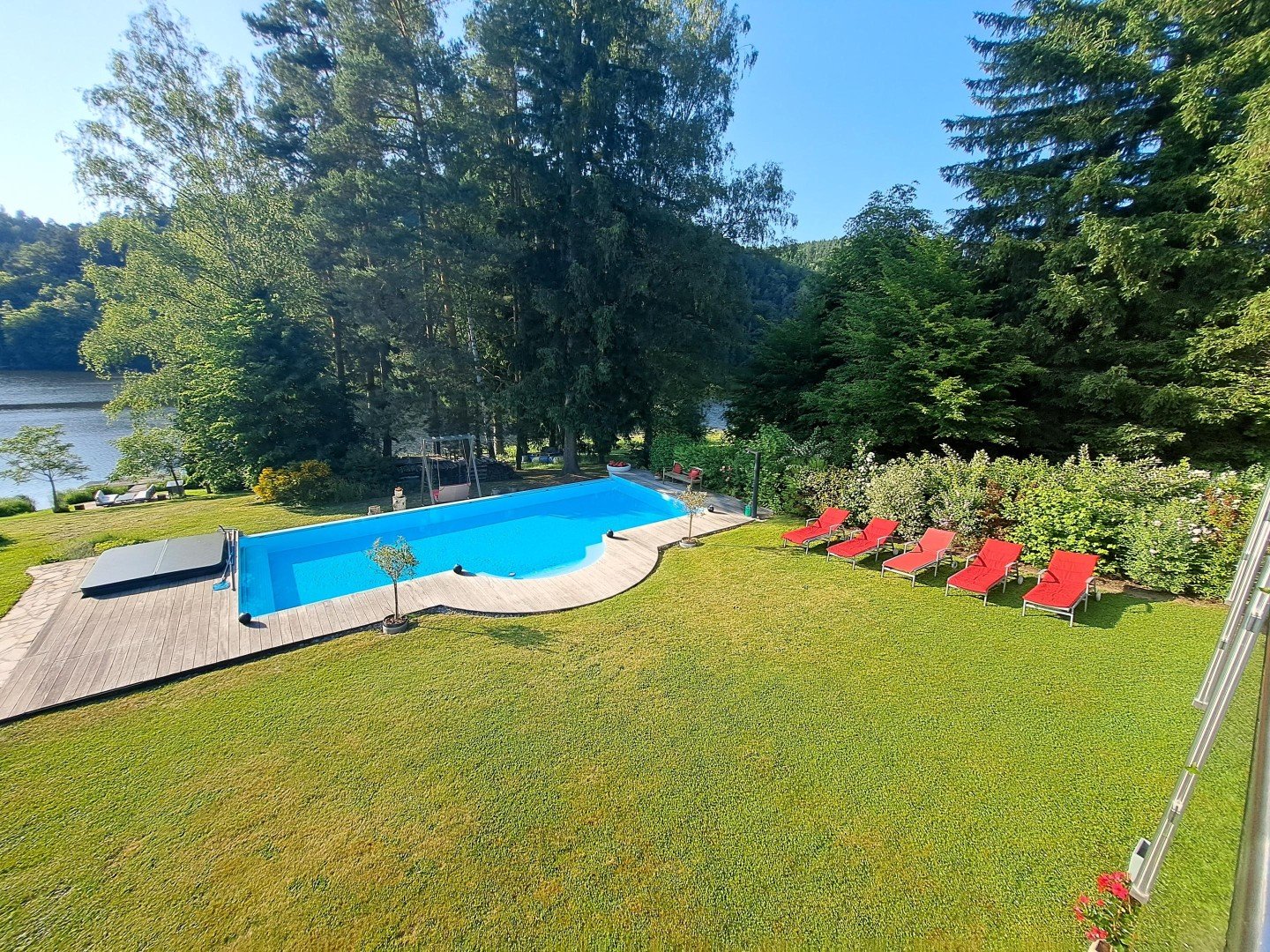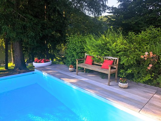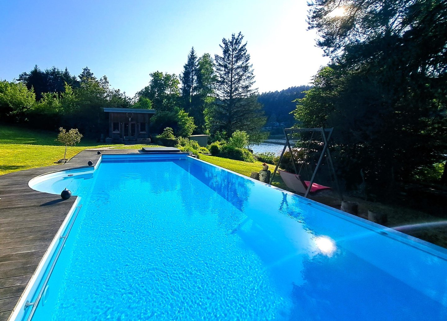 4. Badevergnügen auch an kühleren Tagen verspricht der 12x5 m große, 1,4 m tiefe INFINITY-POOL, ausgestattet mit Unterwasser-Rolldeck und röm. Einstieg. Mittels Erdwärme- und Luftwärmepumpe kann das Wasser bis auf 30 Grad erwärmt werden. Zu Hydromassagen lädt das daneben liegende amerikanische WHIRLPOOL ein.