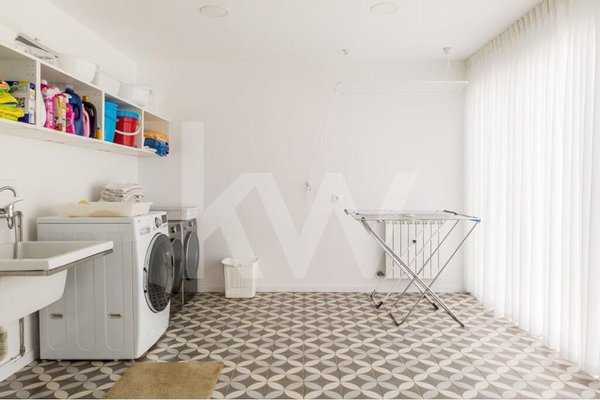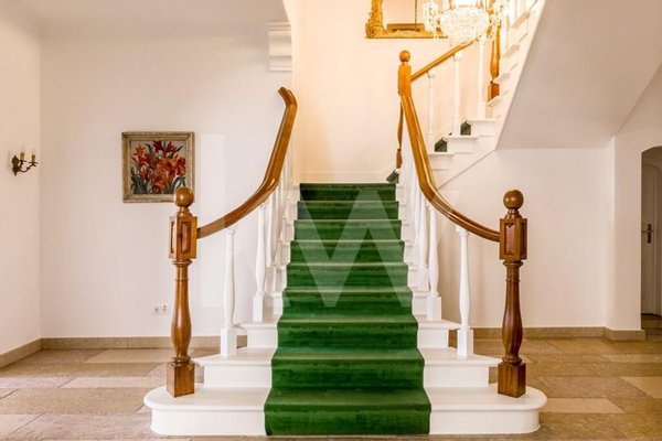- Erster Stock: Flur, Bibliothek, Master-Suite (mit Kleiderschrank, Speisekammer, 2 WC und Fitnessbereich), Wohnzimmer, Esszimmer, Küche, Garage für 8 Autos und Servicebereich (Speisekammer, Waschküche, Garderobe und Schlafzimmer mit WC und Maschinenraum).
