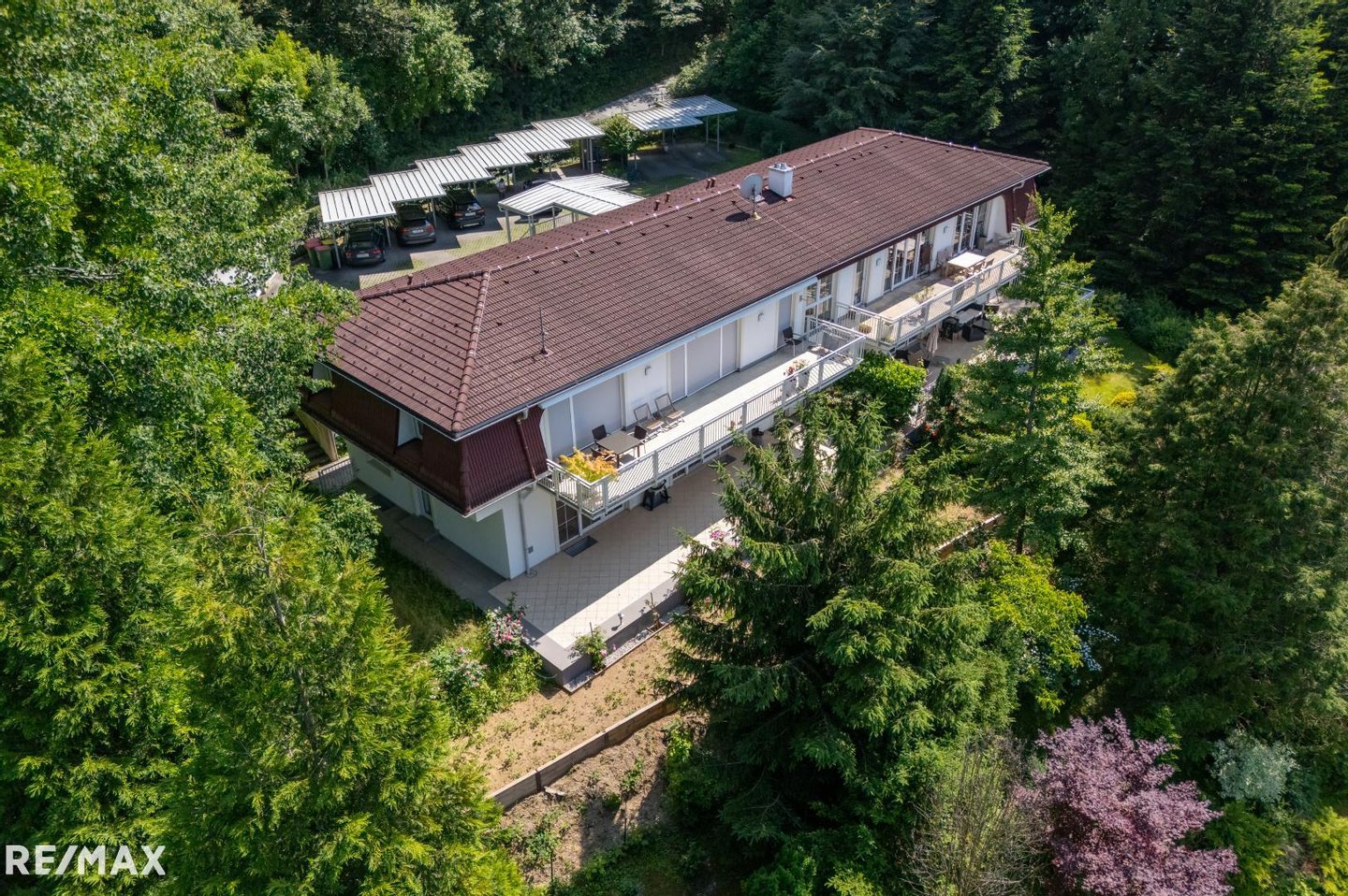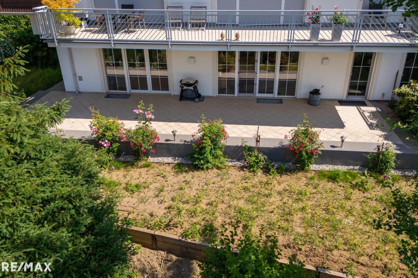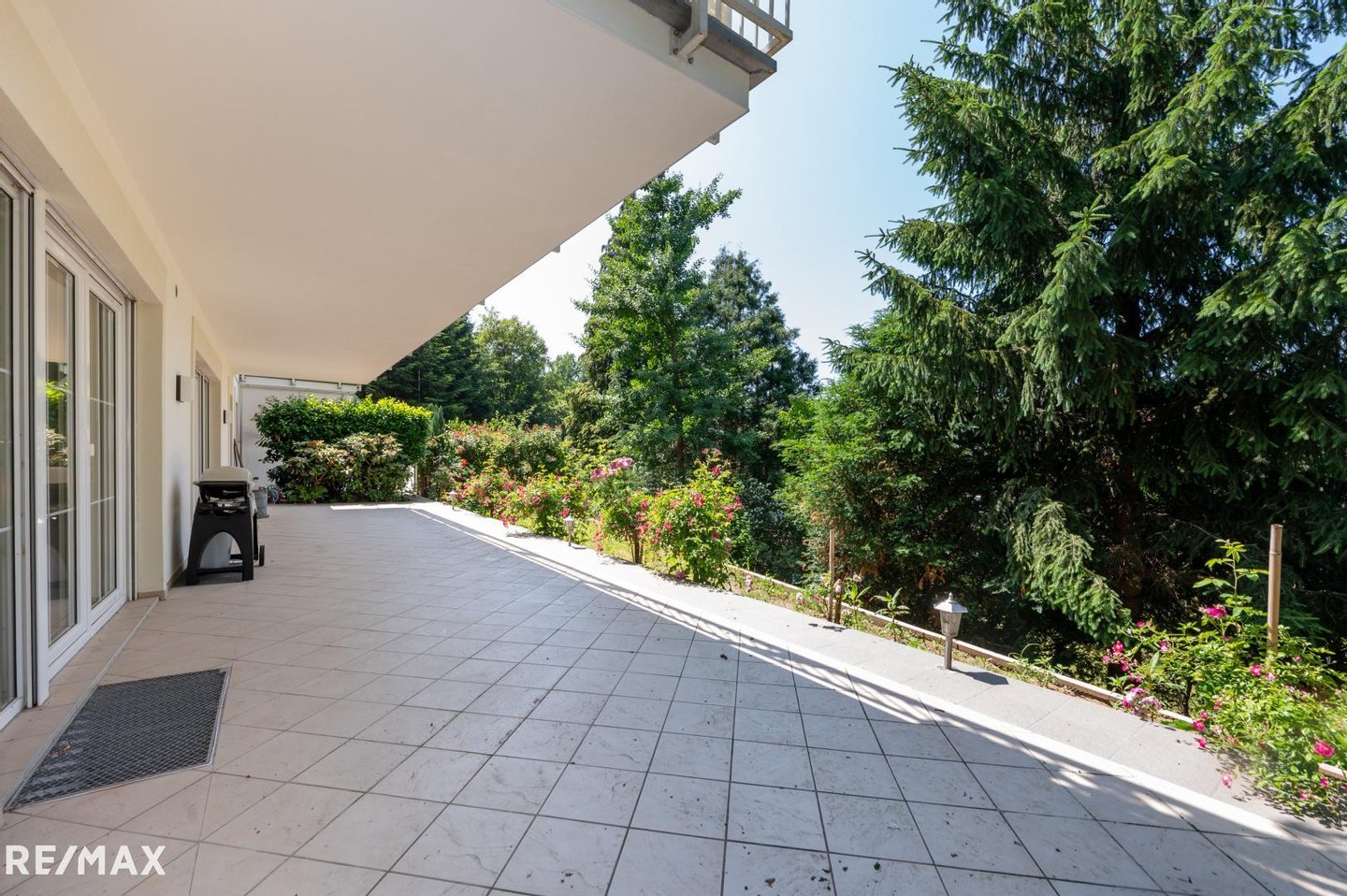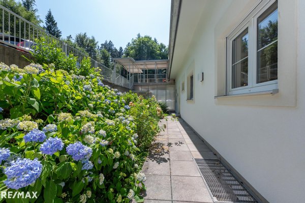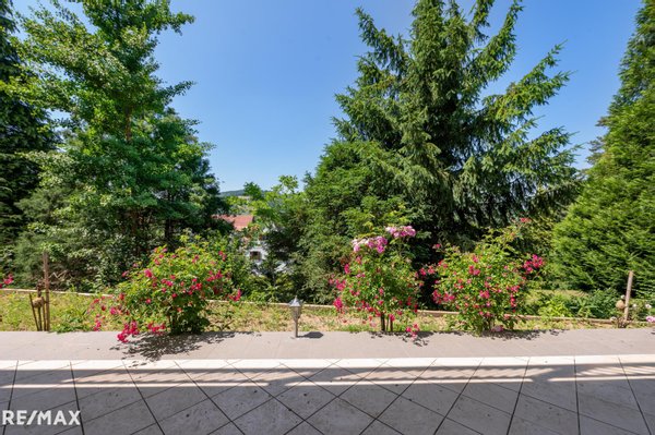 Auf der großen Terrasse genießen Sie ruhige Stunden und lassen den Blick durch die Bäume ins Grüne schweifen. In Ihrem Eigengarten von über 400 m² erfreuen Sie sich der Blütenpracht verschiedener Blumen und Sträucher!