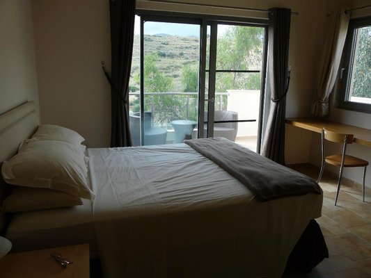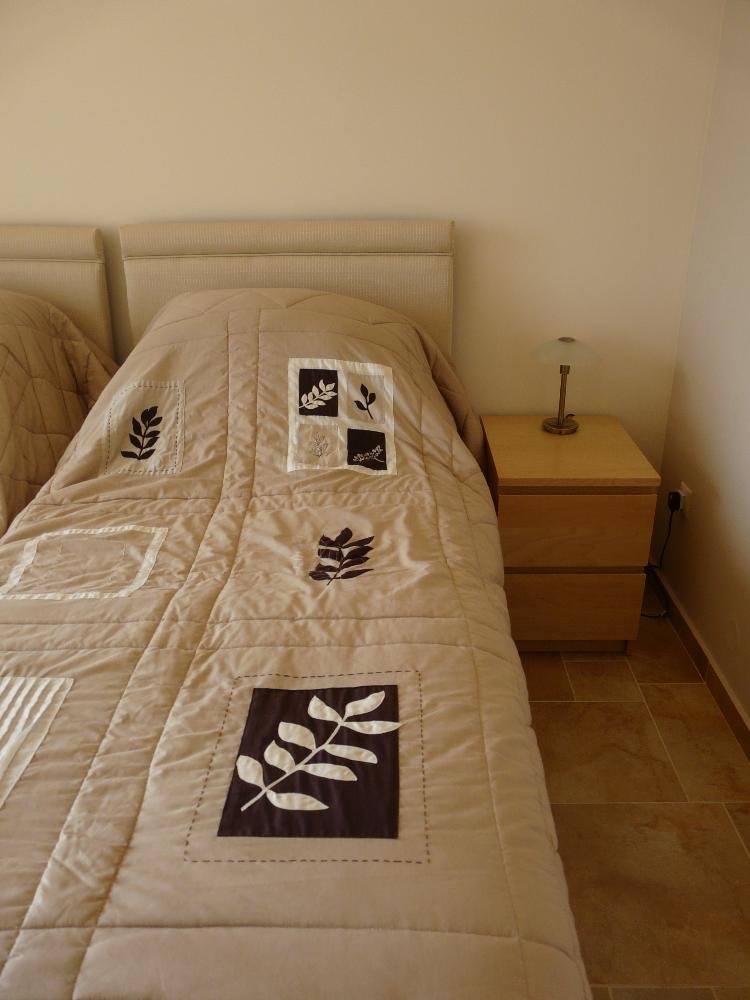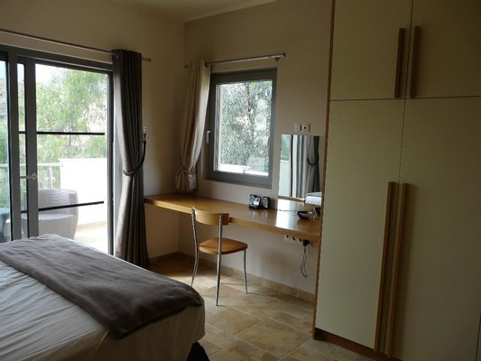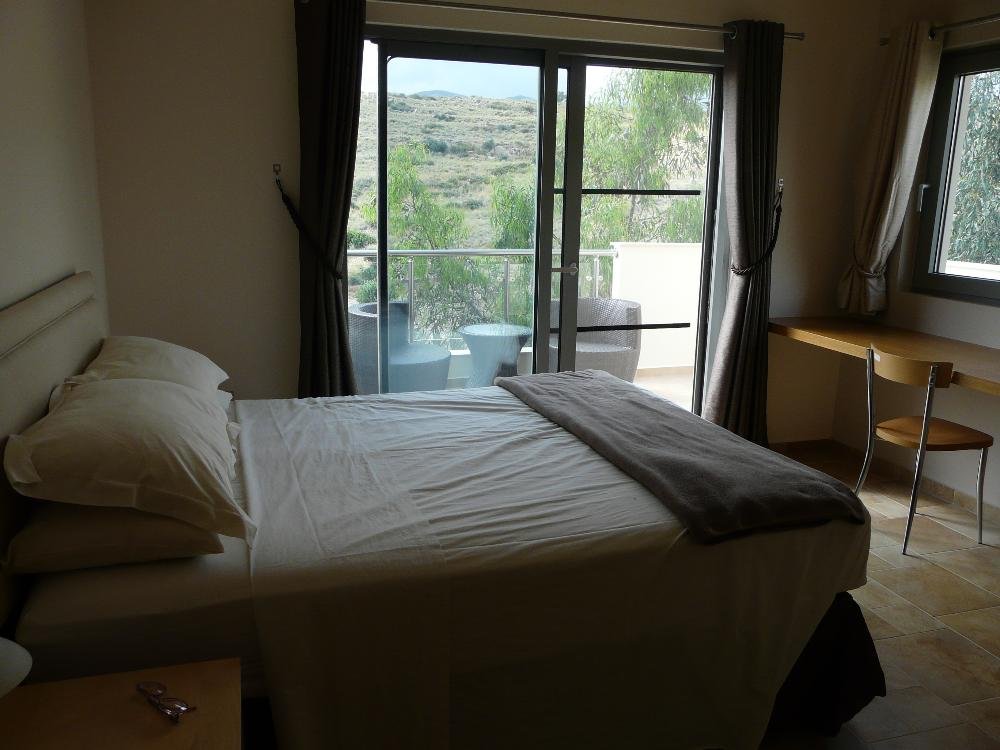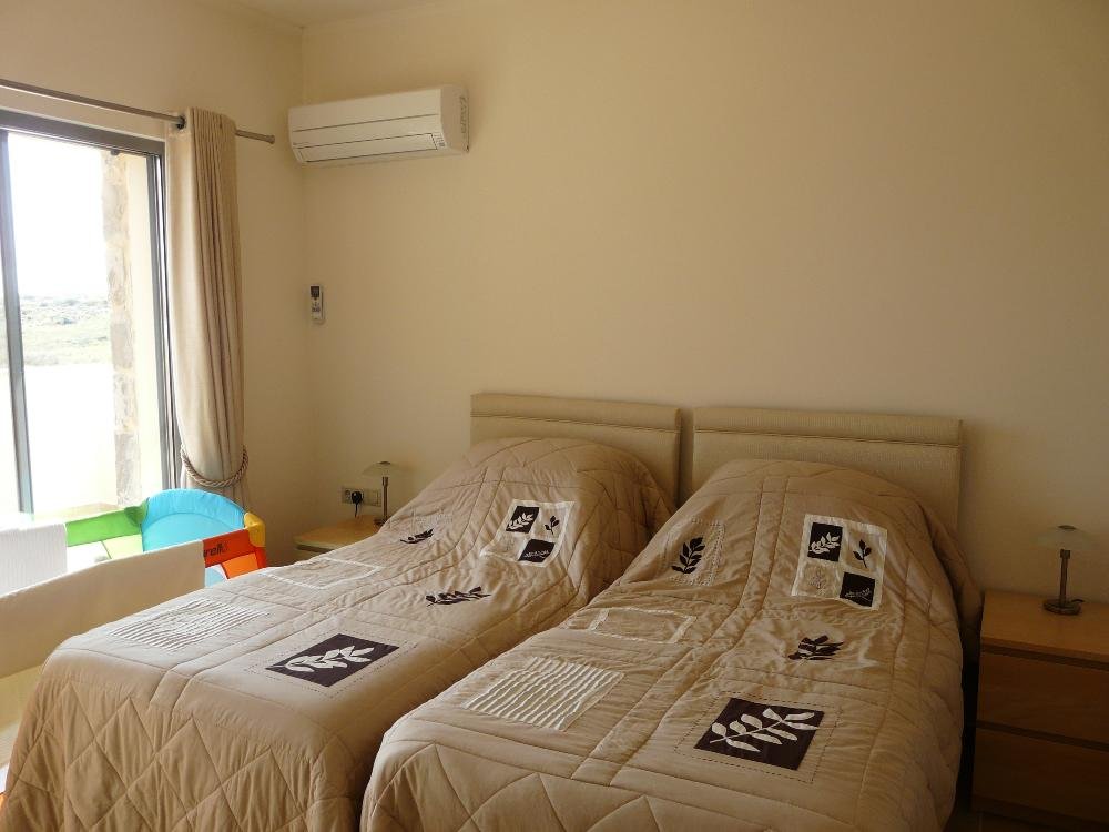 Großes Schlafzimmer mit zwei Einzelbetten und Nachttischen. Einbauschränke und Schminktisch. Terrassentüren führen zu einer gemeinsamen Terrasse mit Blick auf den Pool und Panoramablick auf die Küste. Sitzgelegenheiten und Tisch vorhanden.