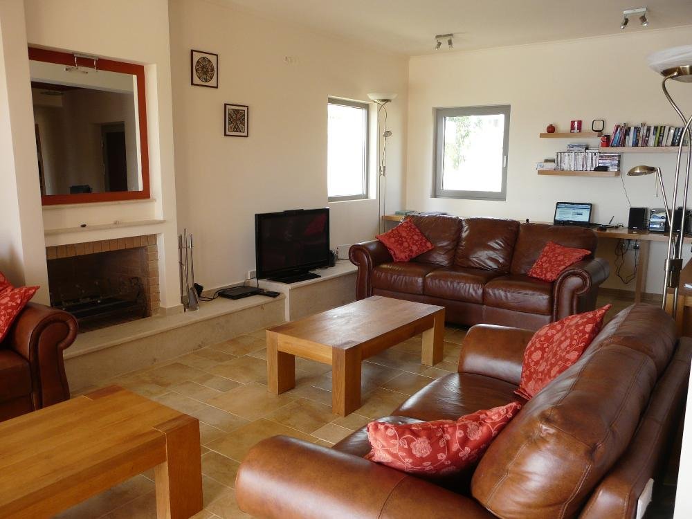 Wohnbereich mit 3 Ledersofas am Kamin (für die Winterabende)