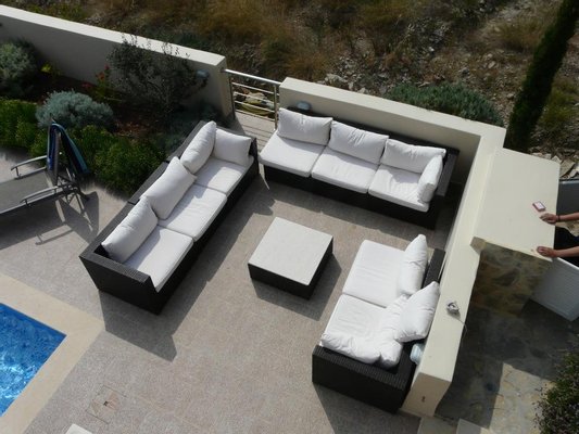 Drei doppelte Terrassentüren führen nach draußen zum Pool, zum BBQ-Bereich, zum Esstisch und den Stühlen aus Marmor sowie zu einem weichen Sitzbereich für bis zu zehn Personen.