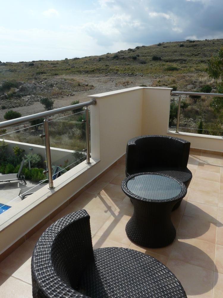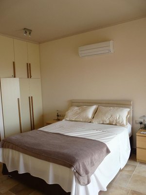 Großes Schlafzimmer mit Kingsize-Bett, Nachttischen, Einbauschränken und Schminktisch mit Haartrockner. Großes en-suite Duschbad mit Waschbecken für Sie und Ihn. Vom Boden bis zur Decke reichende Terrassentüren nach Süden führen zu einem privaten Balkon mit eigenen Sitzgelegenheiten und Tisch. Entspannen Sie sich beim Aufstehen und genießen Sie die warme Sonne, den Blick auf die Berge und das kristallblaue Meer.