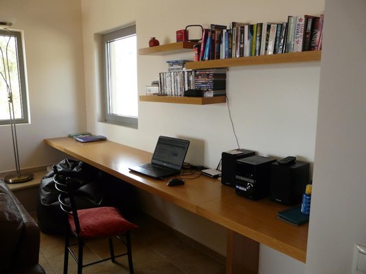 Es gibt auch einen Schreibtisch im hinteren Teil des Wohnzimmers.