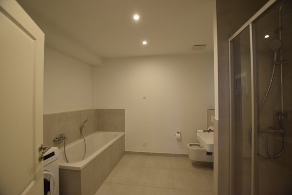 Das geflieste Badezimmer verfügt über moderne Sanitärobjekte sowie eine Dusche.
