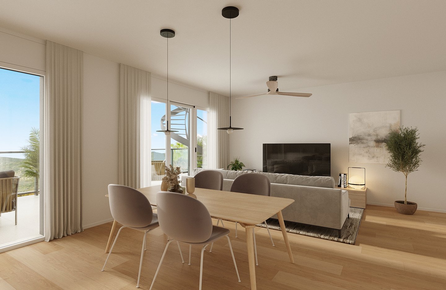 Die Materialien und Ausstattungen wurden sorgfältig ausgewählt, um den Häusern ein hohes Maß an Eleganz, Komfort und Exklusivität zu verleihen. Zu den Highlights gehören Laminatböden, elegante Außenfenster, große Fenster, die für maximale natürliche Belichtung sorgen, eine komplett ausgestattete Küche, moderne Badezimmer mit hochwertigen Armaturen und Sanitäreinrichtungen sowie ein aerothermisches Klimatisierungssystem, das in der gesamten Wohnung installiert ist, einschließlich der Geräte.