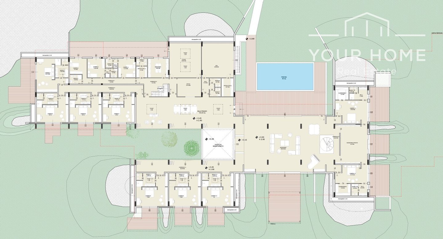 Das Projekt der Villa, das bereits genehmigt wurde, umfasst im Erdgeschoss 1.250 überdachte Quadratmeter, die für 13 Schlafzimmer, 14 Bäder, ein SPA, ein Arbeitszimmer, ein Ankleidezimmer und Serviceräume bestimmt sind, während wir im Untergeschoss weitere 824 überdachte Quadratmeter haben, die auf verschiedene Weise genutzt werden können.