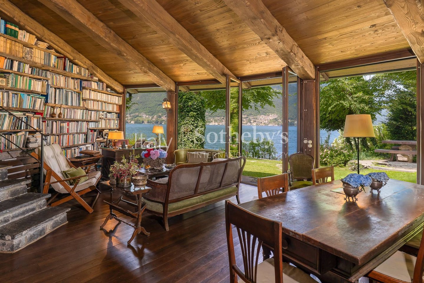Die Villa bietet eine Wohnfläche von ca. 120 m², verteilt auf stilvolle, gemütliche Räume. Die zwei Schlafzimmer mit jeweils eigenem Bad garantieren Privatsphäre und Rückzug. Der Wohnbereich mit eleganten Antiquitäten umfasst zusätzlich ein Schlafsofa für Gäste. Eine verglaste Holzveranda mit direktem Blick auf den See schafft eine traumhafte Kulisse für entspannte Stunden und Momente der Einkehr. Besonders stimmungsvoll sind die Bibliothek, gefertigt aus altem Kastanienholz, und die traditionsreiche Küche mit einem in Granit gehauenen Spülbecken - eine Hommage an die lokale Handwerkskunst.