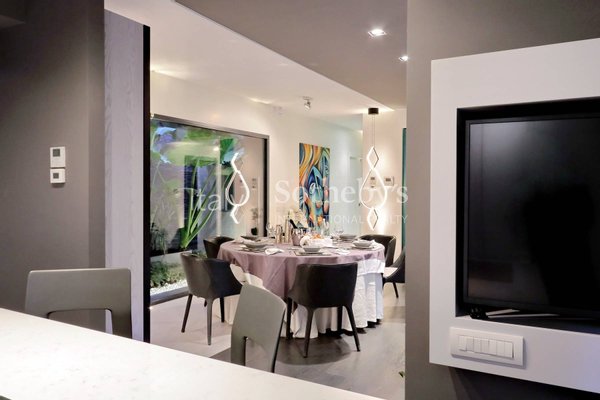 Die Immobilie erstreckt sich über drei Etagen und beeindruckt durch die perfekte Harmonie aus zeitgenössischem Design, funktionaler Raumaufteilung und hochwertigen Materialien. Im Untergeschoss befindet sich ein unabhängiger Gästebereich, bestehend aus Wohnzimmer, Schlafzimmer mit Doppelbett und Bad - ideal für Gäste oder Personal.