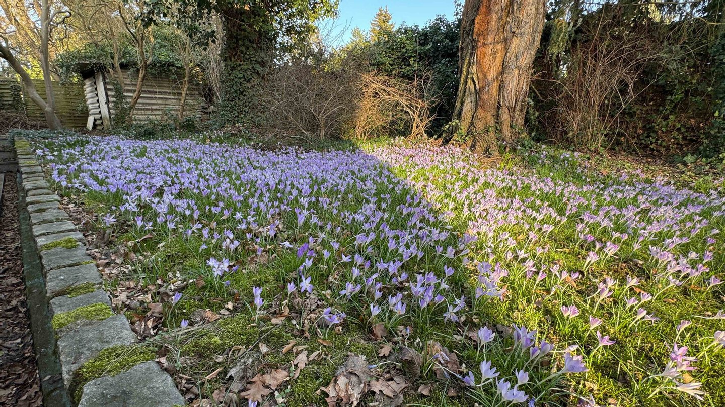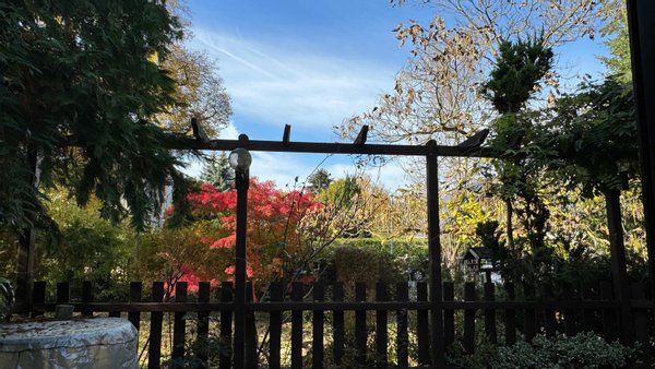 Bepflanzung mit einem alten Mammutbaum, Nadelbäumen, zwei Birken, 1 Eiche und 1 Ulme sowie Blumenrabatten
