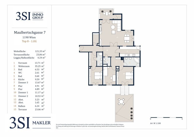 Diese gepflegte Neubauwohnung besitzt eine Wohnfläche von ca. 121 m², eine Terrassenfläche von ca. 23m² und einen kleinen ca. 3 m² großen Balkon/Loggia und befindet sich im 1. Liftstock. Diese großzügige 4-Zimmer-Wohnung überzeugt mit ihrem durchdachten Grundriss, einer ansprechenden Ausstattung in beliebter Grünruhelage.