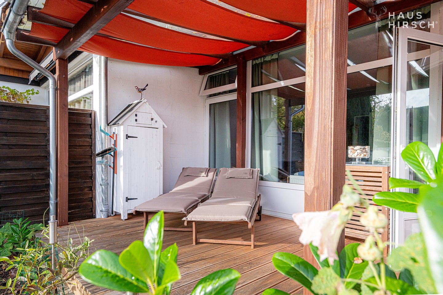 Die große überdachte Terrasse lädt zum Sonnenbaden oder einfach nur zum Verweilen im Freien ein. Spätestens hier sollte die Entspannung einsetzen, bei einem schönen Glas Wein am Grillabend oder einfach nur einer Tasse Tee oder Kaffee in der Nachmittagssonne.