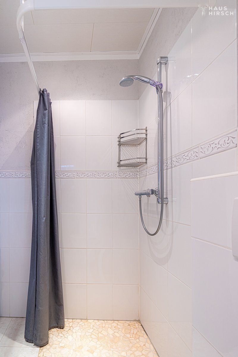 Links davon befindet sich das moderne Badezimmer mit bodentiefer Dusche und zusätzlichem Waschmaschinenanschluss.