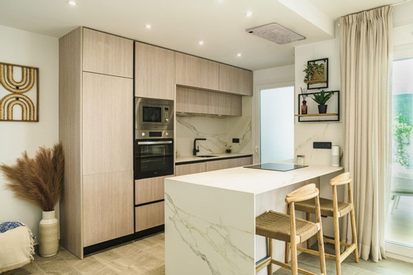 Die Küche ist in einem schlichten, modernen Design mit hochwertigen Materialien gestaltet und mit allem nötigen Komfort und Funktionalität ausgestattet. Dank der offenen Raumaufteilung mit stilvoller Bar entsteht ein luftiger Wohnraum - ideal für den Empfang von Gästen oder zum Entspannen.