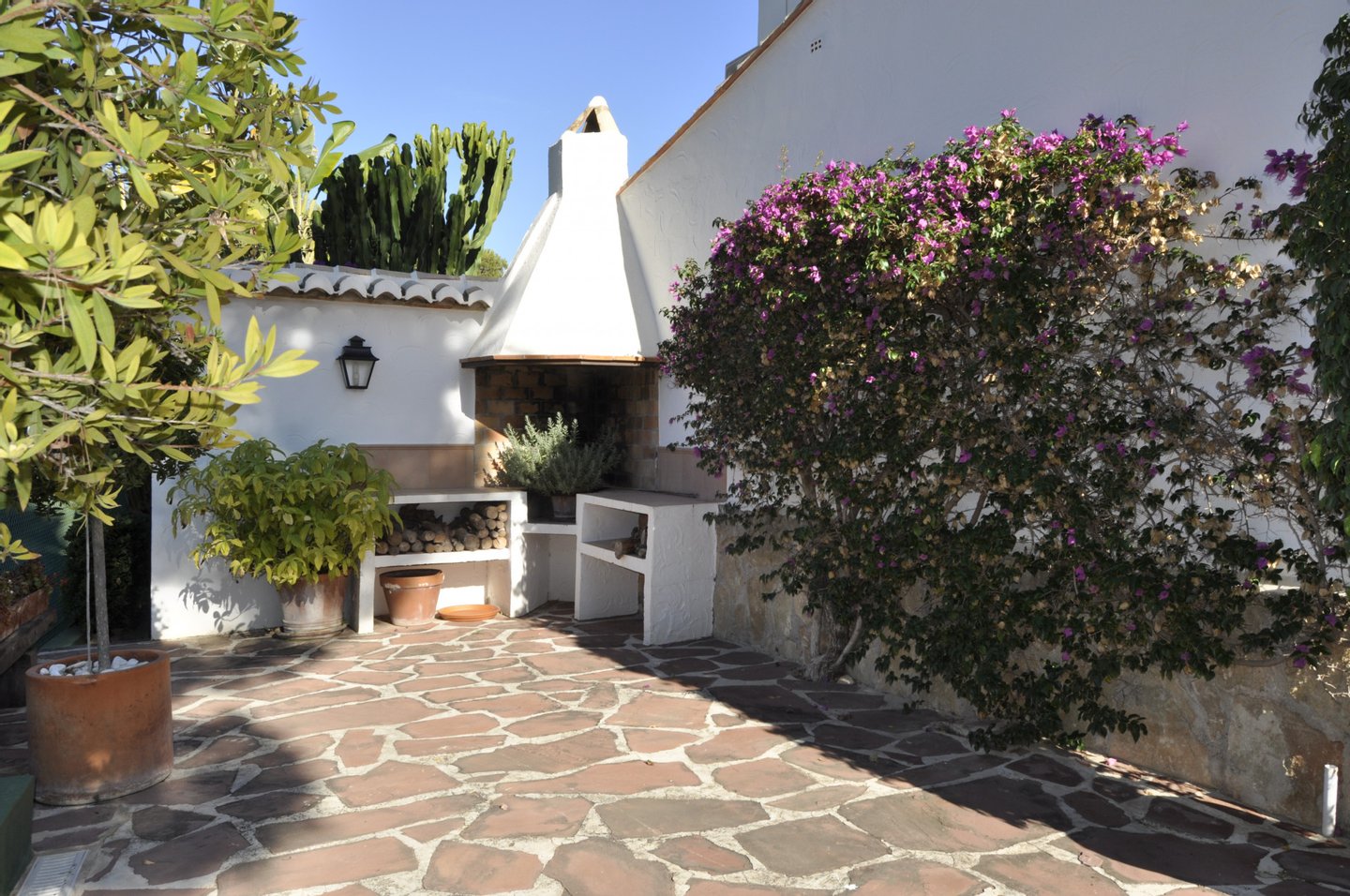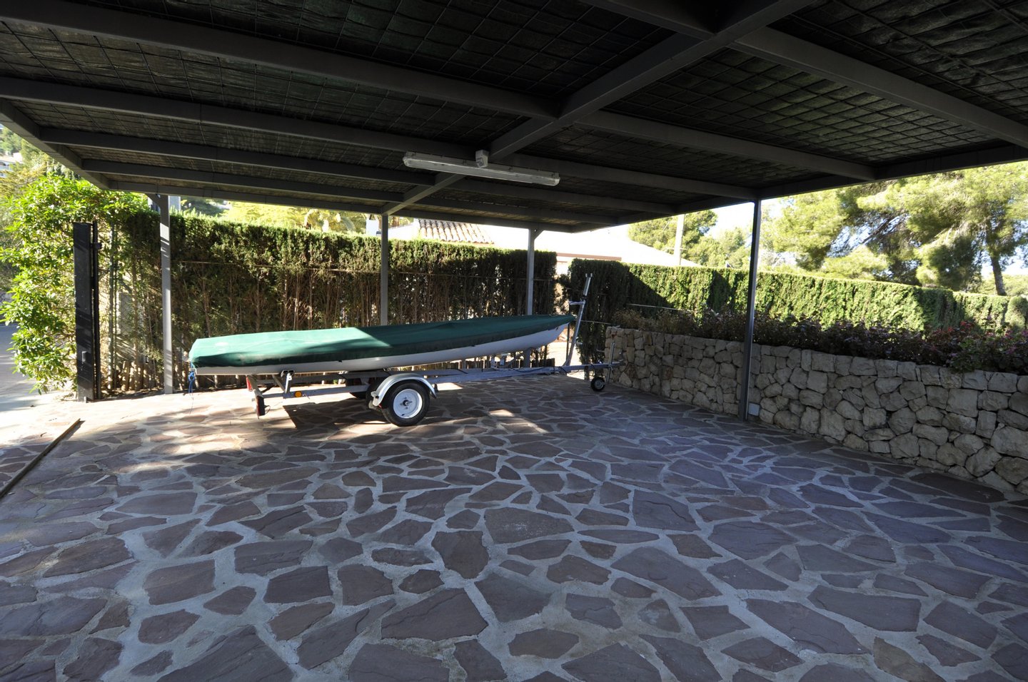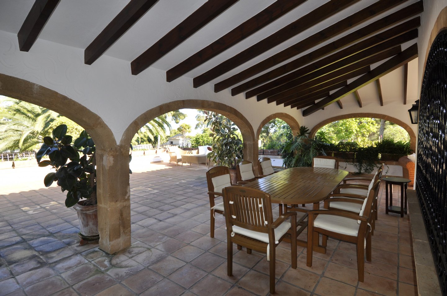 Im Außenbereich mit überdachter Terrasse gibt es ein Bad neben dem Pool, der von einem schönen und mediterran bewachsenen Garten umgeben ist.