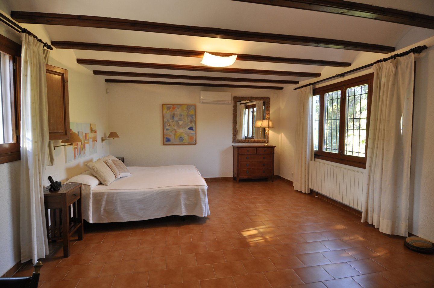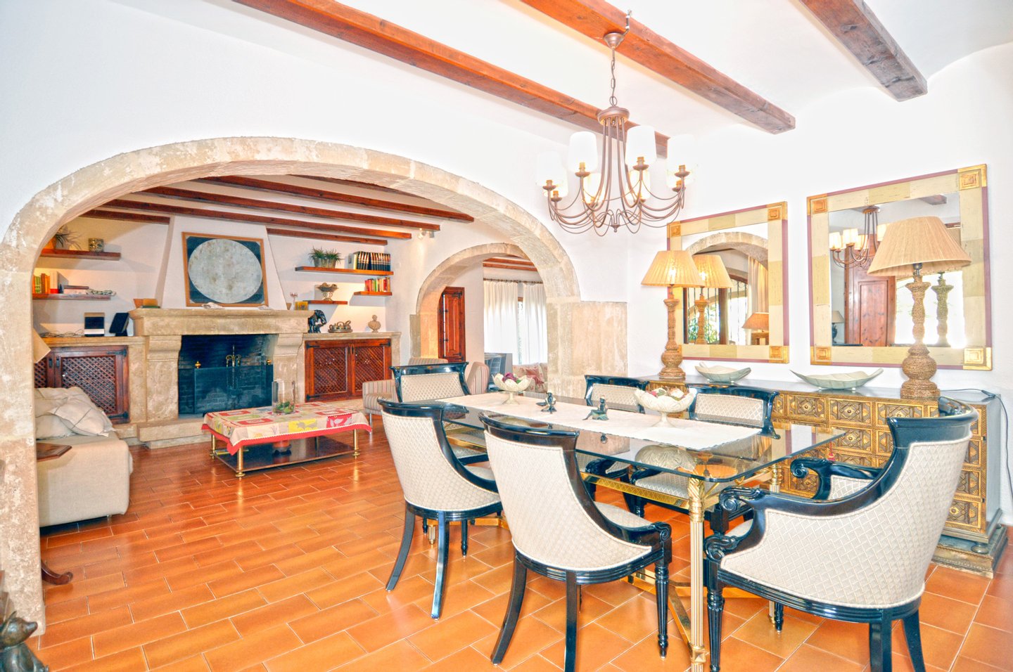 Im Erdgeschoss befinden sich ein großer Wohnbereich mit einem Kalksteinkamin (charakteristisch für diese Region) und Direktzugang zur geräumigen, überdachten Veranda mit Aussicht auf Garten und Pool. Des Weiteren besteht diese Etage aus einem gemütlichen Wohnraum, einer kürzlich renovierten und komplett mit Elektrogeräten und Waschbereich ausgestatteten Küche, drei Doppelschlafzimmer mit Einbauschränken und ein Schlafzimmer mit eigenem Badezimmer für das Hauspersonal.