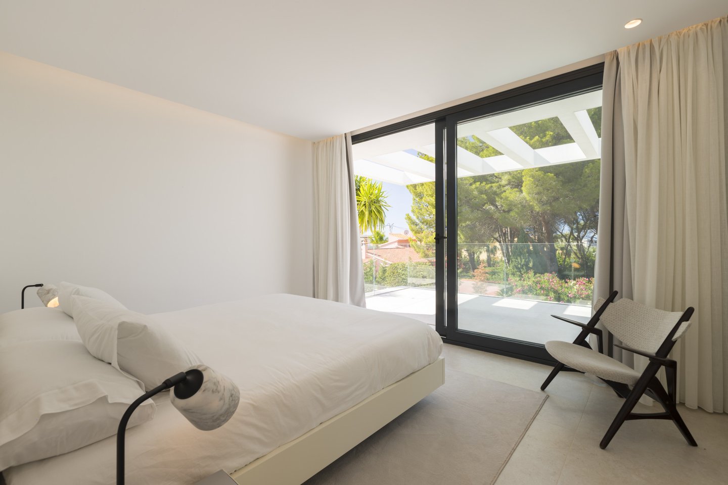 Das Haus ist in ein geräumiges Wohnzimmer, ein Esszimmer, eine offene Küche mit einer zentralen Insel aufgeteilt, alle diese Räume bieten Blick auf den Garten und den Poolbereich sowie einen schönen Terrassenbereich. Auf dieser Etage finden wir 2 Doppelzimmer mit großen Schränken und jeweils eigenem Bad sowie direktem Zugang zur Terrasse und zum Garten. Schließlich ein drittes Einzelzimmer mit eigenem Bad.