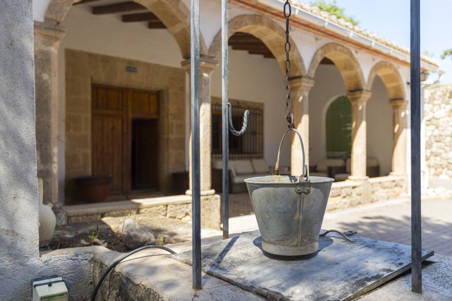 Das Haupthaus verfügt über einen großzügigen Eingangsbereich mit Kamin und kleinem Arbeitszimmer, ein Wohnzimmer, ein Esszimmer sowie eine Küche mit Vorratsraum und Zugang zu einem Außenhof. Im Obergeschoss befindet sich der Schlafbereich mit 2 Schlafzimmern, 1 Badezimmer und dem Hauptschlafzimmer mit Ankleideraum und eigenem Bad. Außerdem gibt es eine großzügige Terrasse mit freiem Blick auf den Gartenbereich.