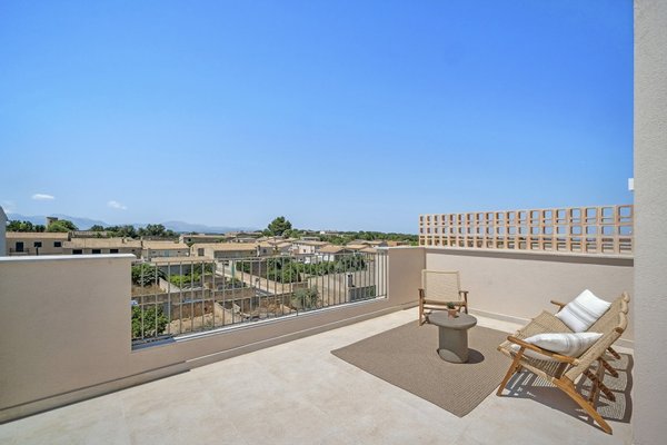 Von der oberen Etage führt eine Treppe auf die großzügige Dachterrasse, von der aus Sie einen atemberaubenden Blick auf das Tramuntana-Gebirge und die charmante Stadt Artá genießen können.
