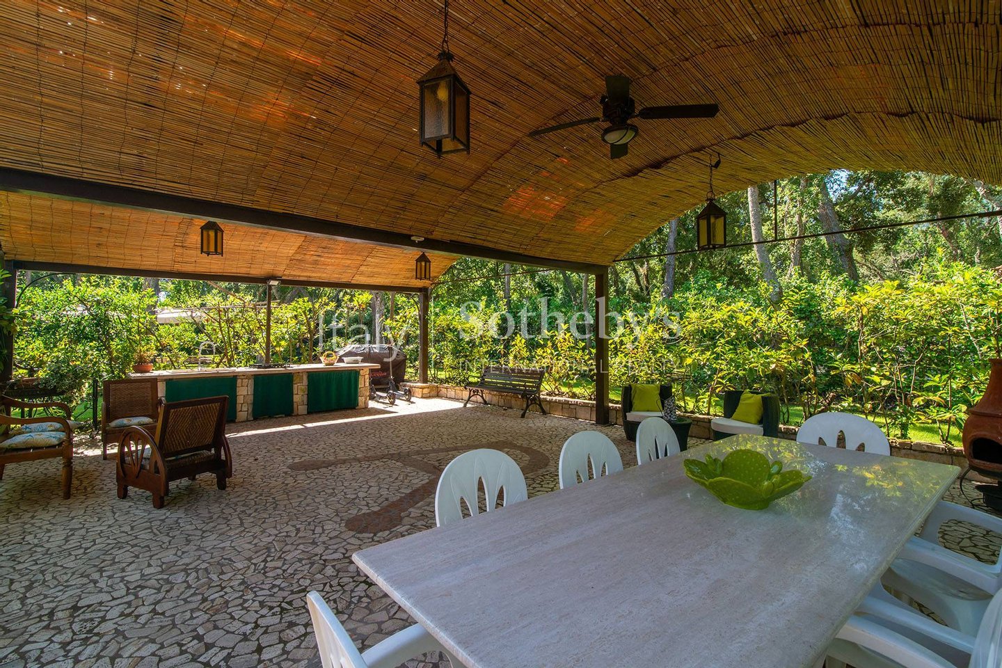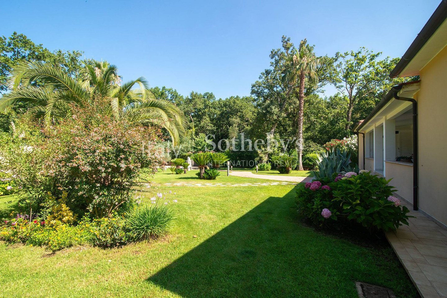 Einzigartige Villa auf einer Ebene in der herrlichen Baia d'Argento in Sabaudia, eingebettet in einen üppigen Privatgarten von ca. 5.000 m², unterteilt in vier Bereiche mit Eichen, Korkeichen, Palmen, Magnolien, Cycaspflanzen, Obstbäumen und einem majestätischen Olivenbaum.