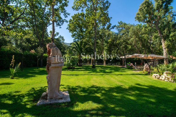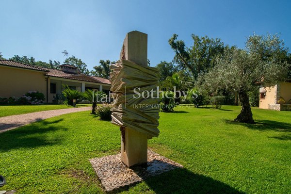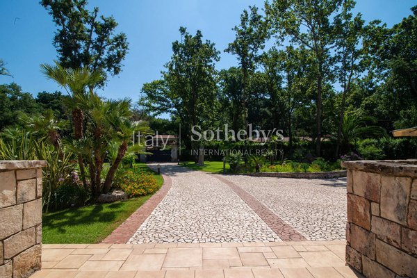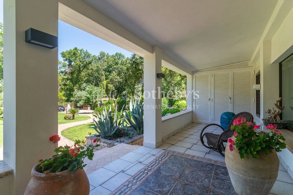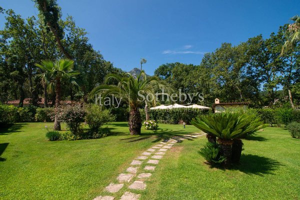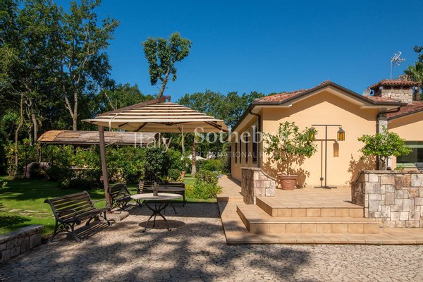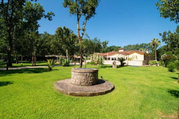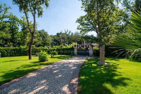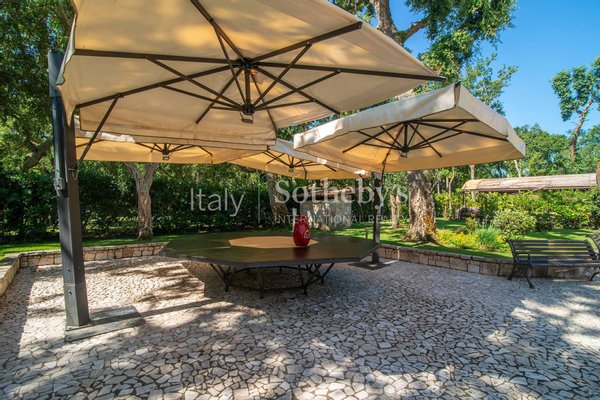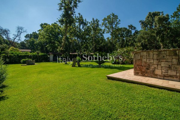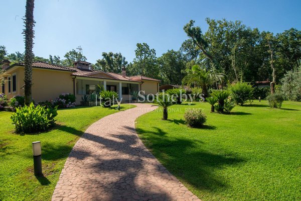 Einzigartige Villa auf einer Ebene in der herrlichen Baia d'Argento in Sabaudia, eingebettet in einen üppigen Privatgarten von ca. 5.000 m², unterteilt in vier Bereiche mit Eichen, Korkeichen, Palmen, Magnolien, Cycaspflanzen, Obstbäumen und einem majestätischen Olivenbaum.