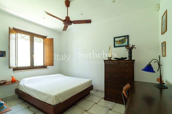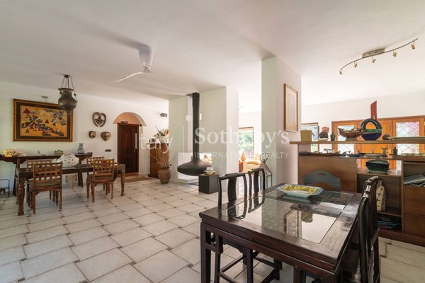 Im Inneren bietet die Villa einen hellen Wohnbereich, eine ausgestattete Küche, ein Arbeitszimmer, ein Hauptschlafzimmer und zwei Badezimmer, eines davon mit Whirlpool. Zu beiden Seiten des Wohnzimmers befinden sich zwei spiegelgleiche, unabhängige Apartments mit separatem Eingang, Wohnzimmer, Bad, Küche und Doppelzimmer.