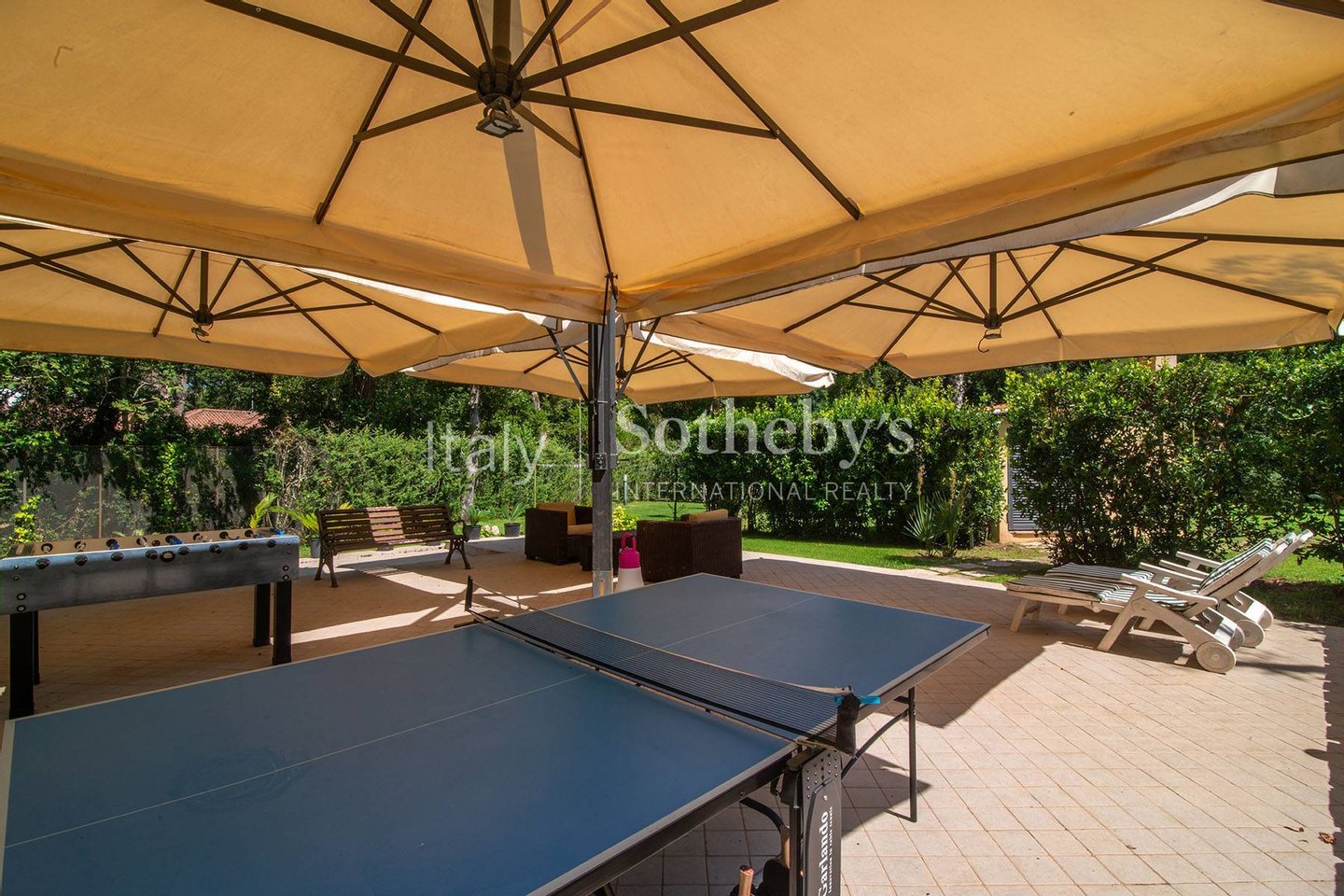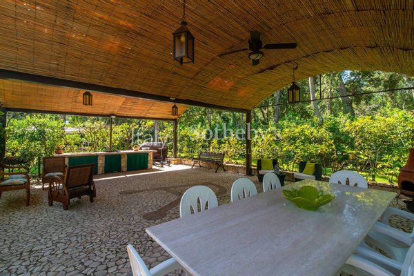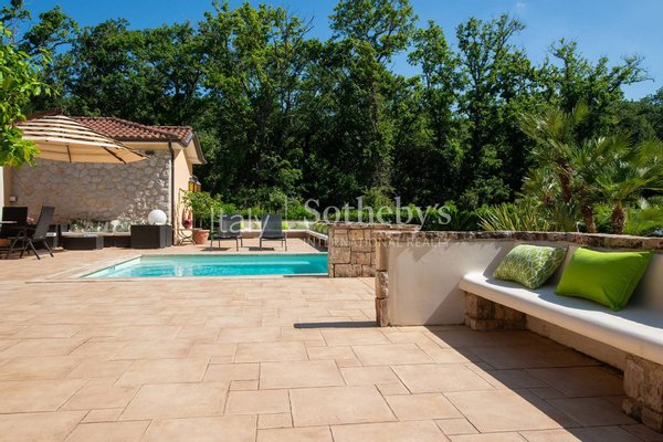 Im Außenbereich befinden sich eine beheizbare Veranda, ein großer Pavillon mit gemauerter Küche und Grillplatz sowie zahlreiche gesellige Sitzbereiche. Der gepflegte Garten umfasst einen Essbereich mit maßgefertigtem achteckigem Tisch, einen ca. 100 m² großen Spiel- und Musikbereich sowie ein spektakuläres römisches Becken mit Whirlpool, stimmungsvoller Beleuchtung und integrierter Sitzbank. Abgerundet wird der Außenbereich durch einen Holzofen und einen Brunnen.