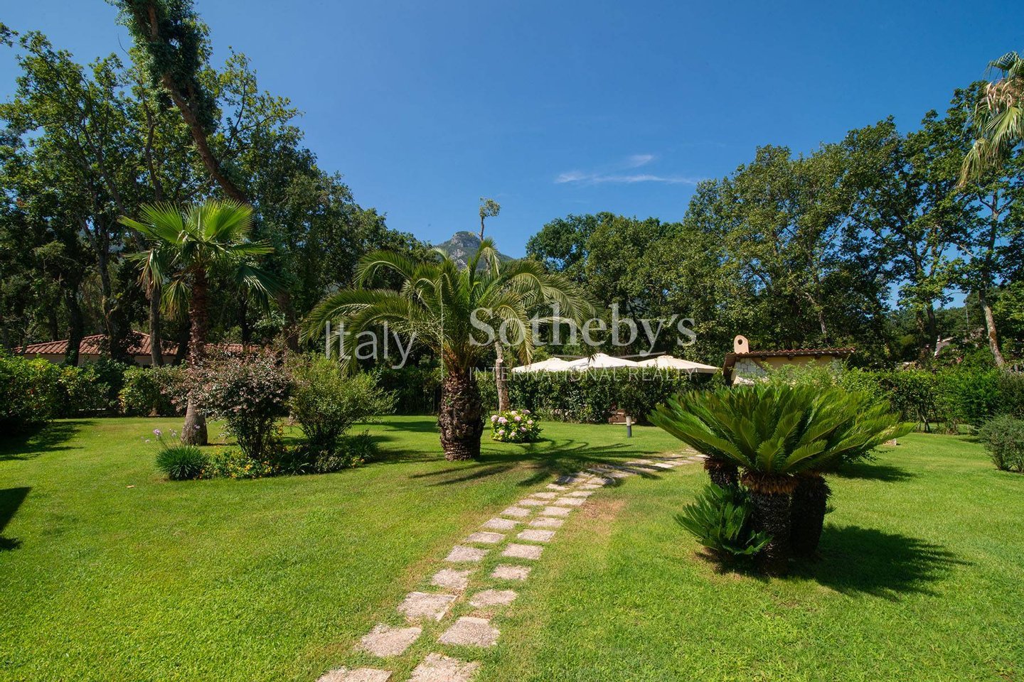 Einzigartige Villa auf einer Ebene in der herrlichen Baia d'Argento in Sabaudia, eingebettet in einen üppigen Privatgarten von ca. 5.000 m², unterteilt in vier Bereiche mit Eichen, Korkeichen, Palmen, Magnolien, Cycaspflanzen, Obstbäumen und einem