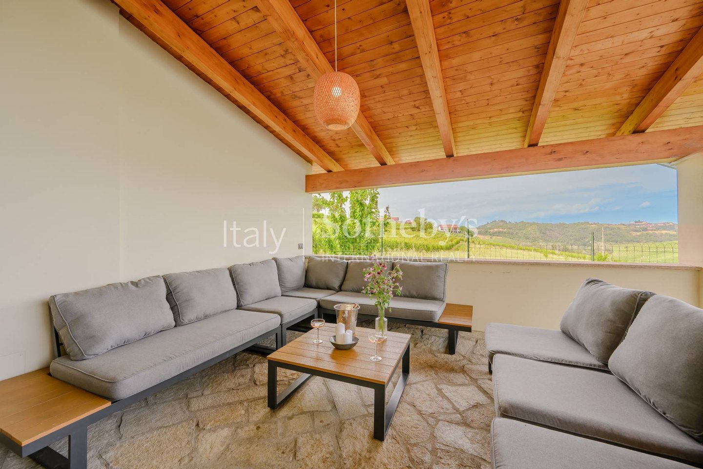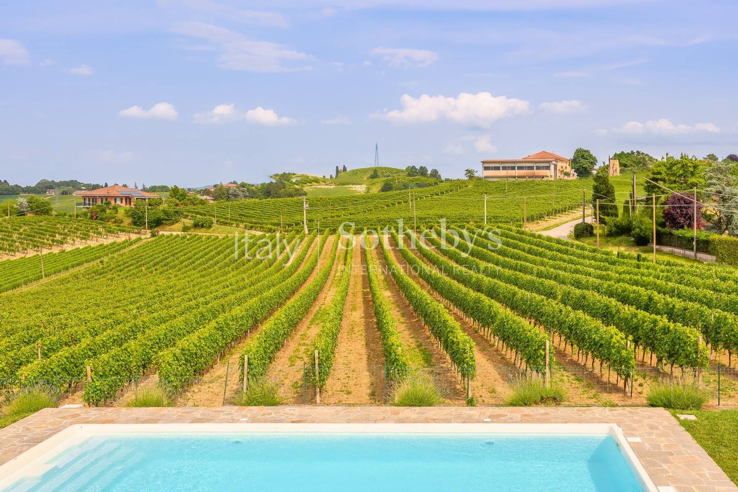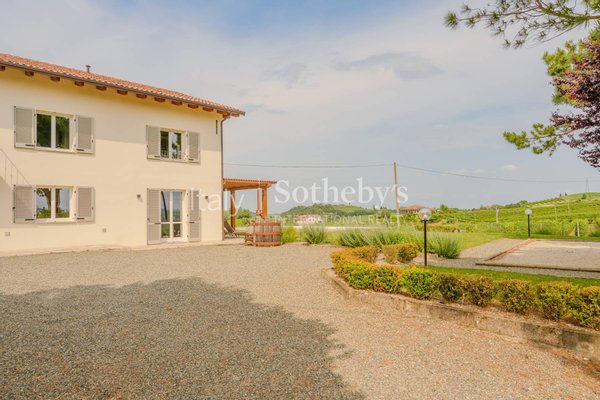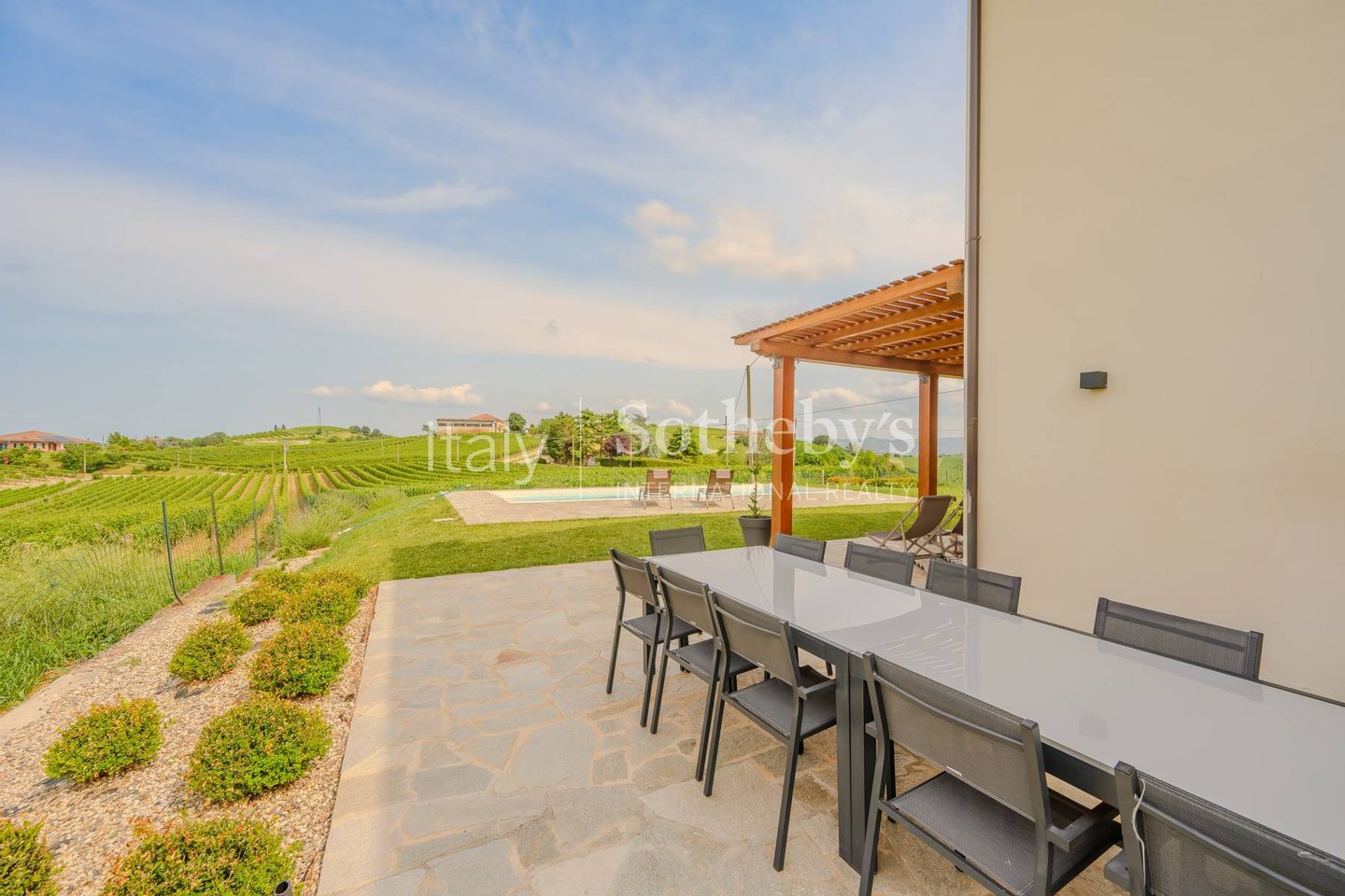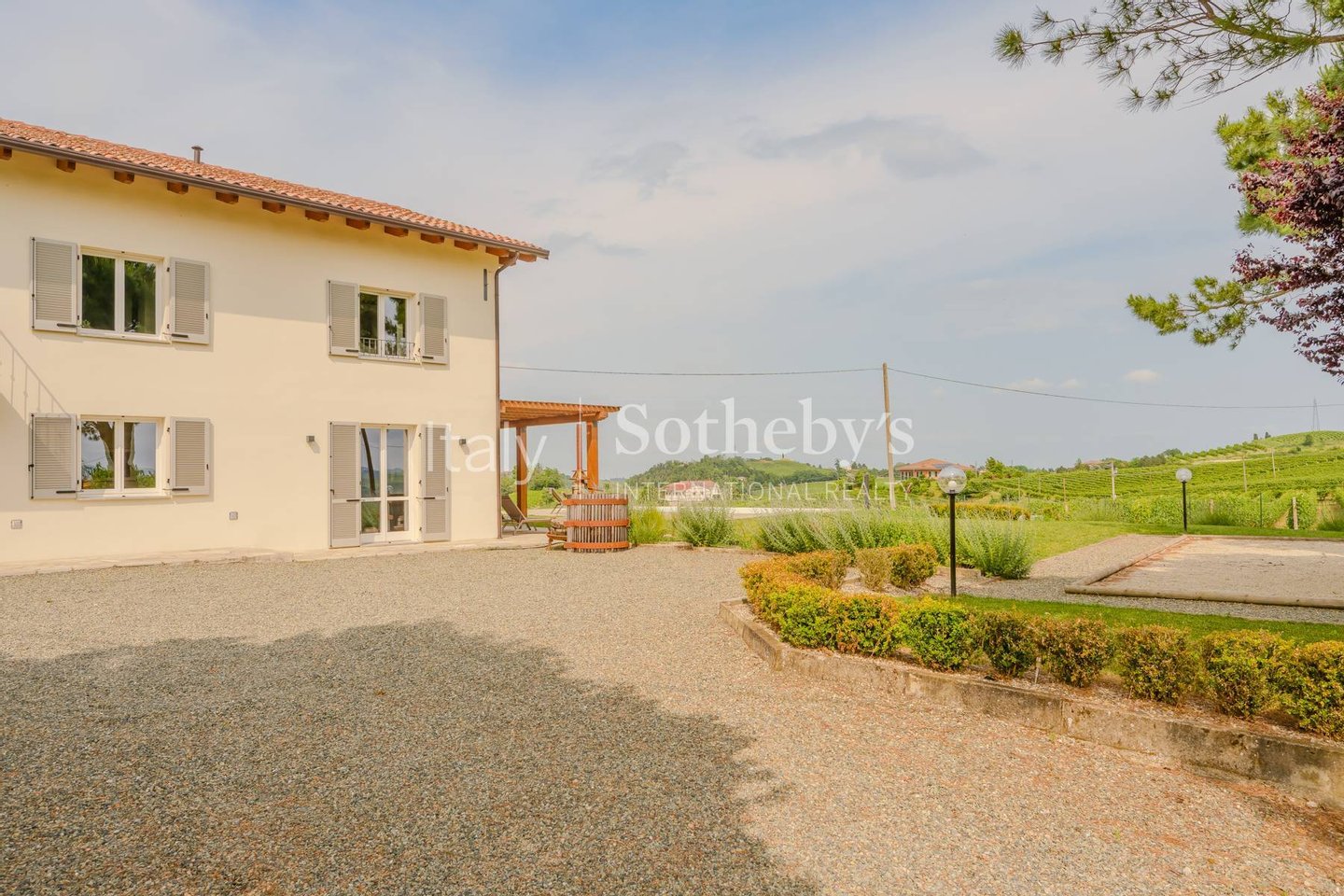 Eingebettet in die zeitlose Landschaft der Hügel rund um Nizza Monferrato - zwischen sanften Weinreben und spektakulären Ausblicken - vereint diese charmante Villa auf harmonische Weise Natur, zeitgenössische Architektur und exklusiven Wohnkomfort.