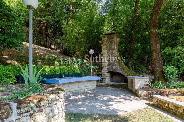 Der eindrucksvolle Garten beherbergt neben einem Grillplatz auch einen Außenkamin.