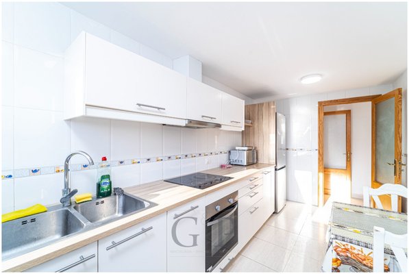 Rechts befindet sich die geschlossene, funktionelle und gut erhaltene Küche, die mit dem Wohn-Esszimmer verbunden ist, einem gemütlichen Raum mit direktem Zugang zu einem der Balkone, der ideal ist, um den Außenbereich zu genießen.