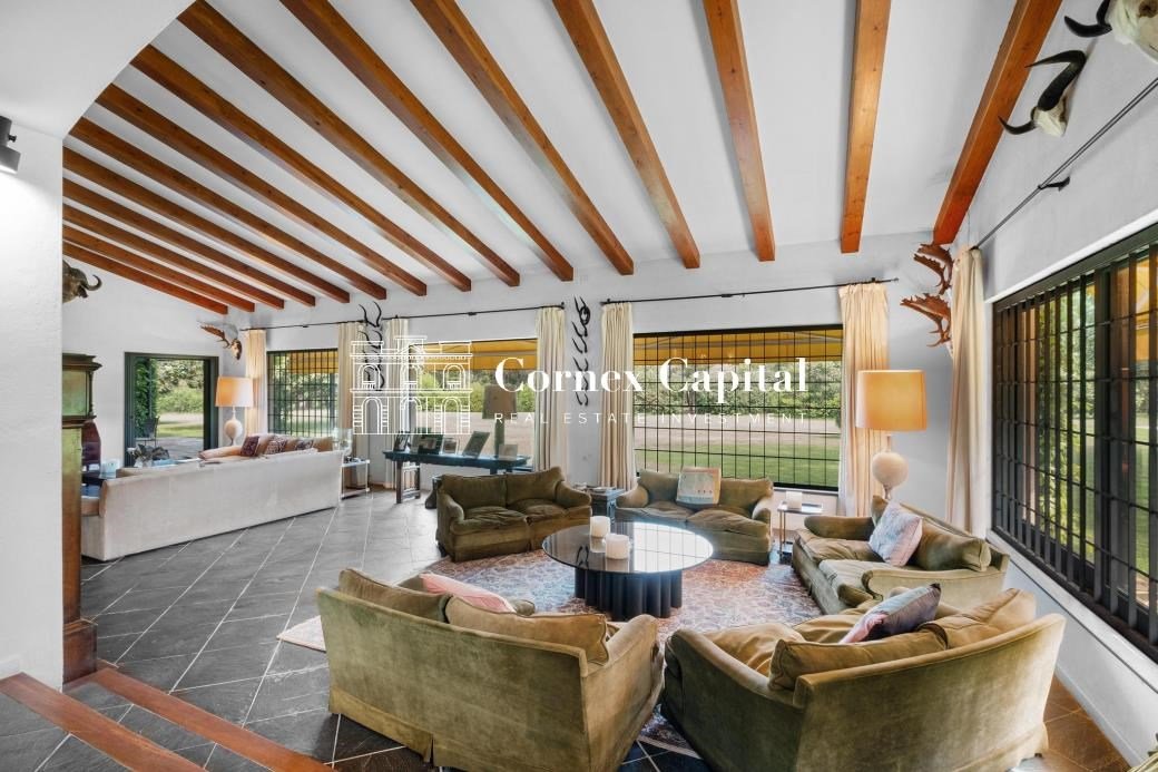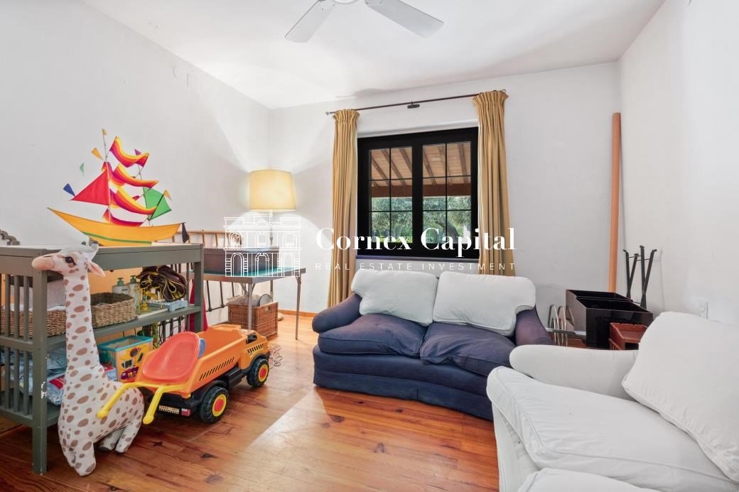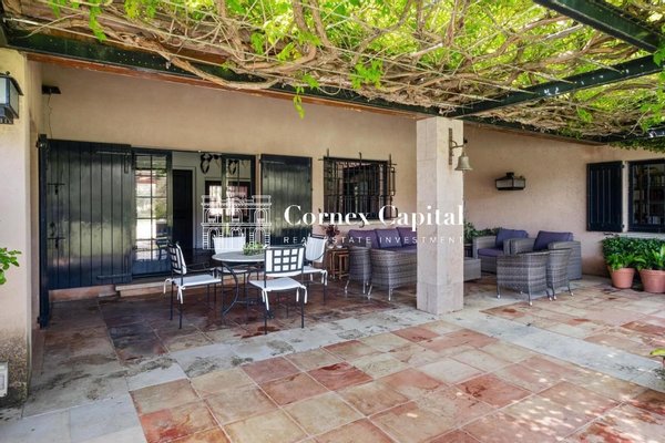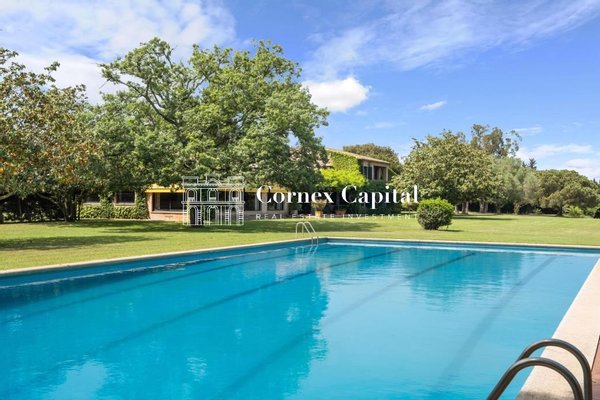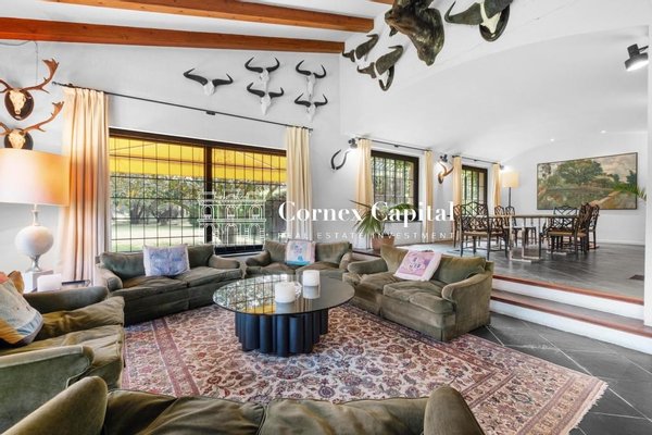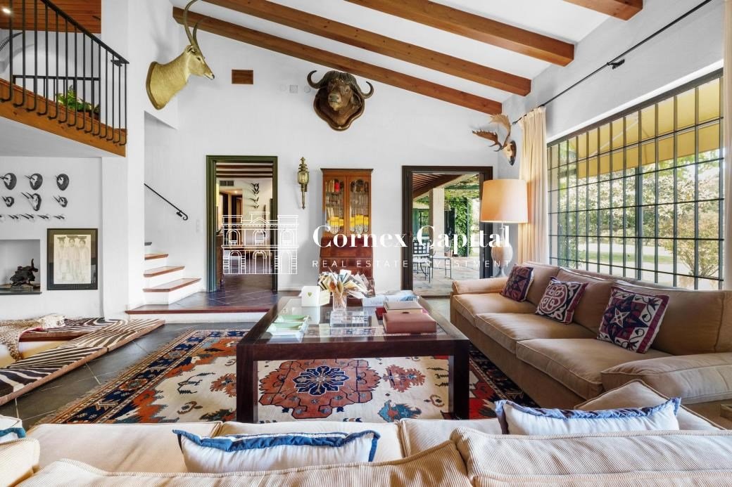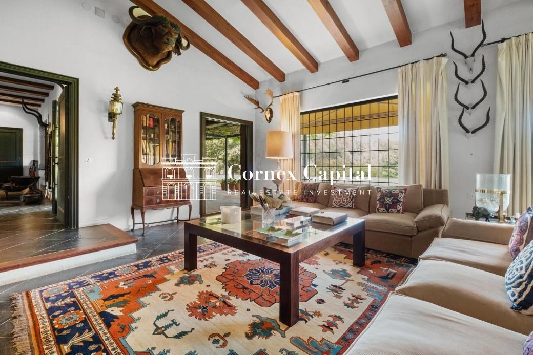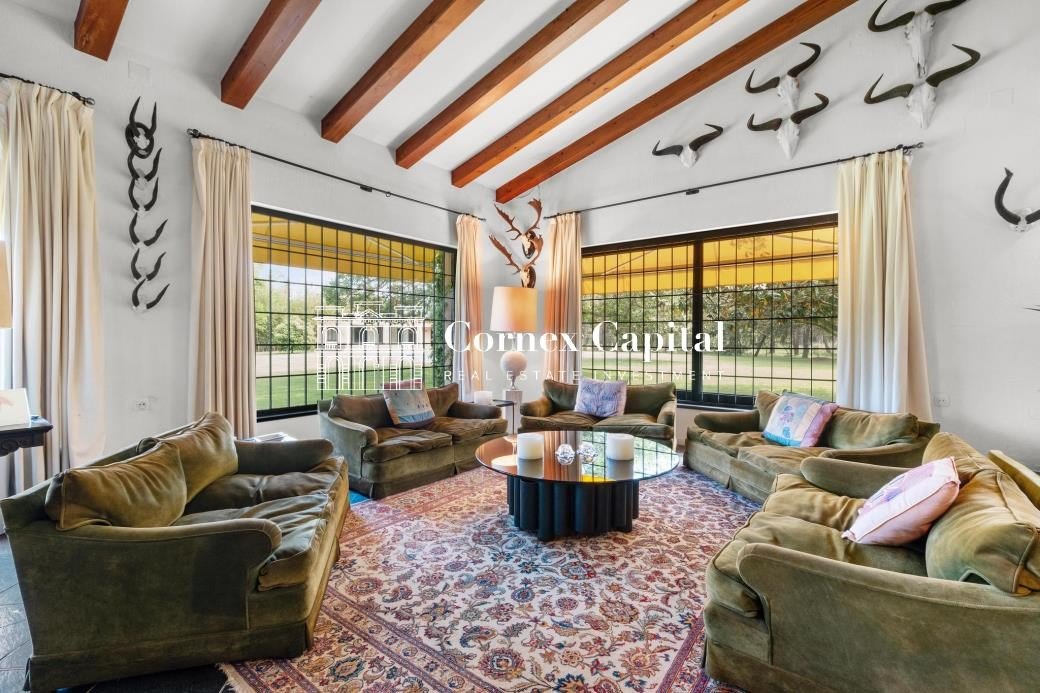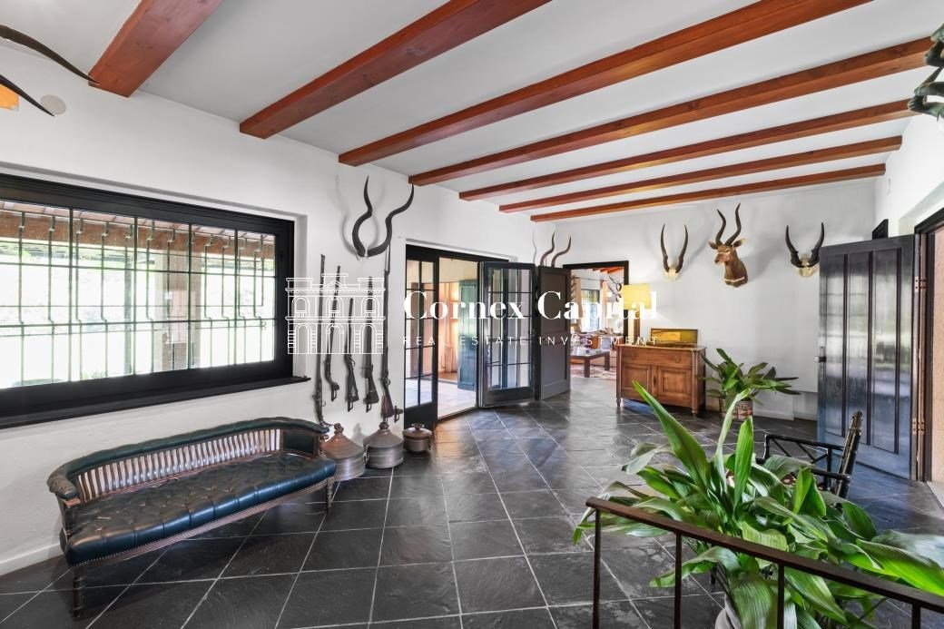 Beim Betreten des Hauses führt ein elegantes Foyer auf eine Terrasse mit Blick auf den Garten- und Poolbereich sowie auf ein Gästebad. Rechts vom Eingang befindet sich eine geräumige Küche mit Essbereich, ein informelles Esszimmer und mehrere Nebenräume: eine Waschküche, ein Personalschlafzimmer mit eigenem Bad, ein zweiter Hauswirtschaftsraum und ein Innenhof. Vom Hauptflur führt eine Treppe in den Weinkeller. Im selben rechten Flügel befindet sich ein gemütliches Wohnzimmer mit Kamin und ein geräumiges und helles Esszimmer.