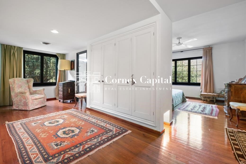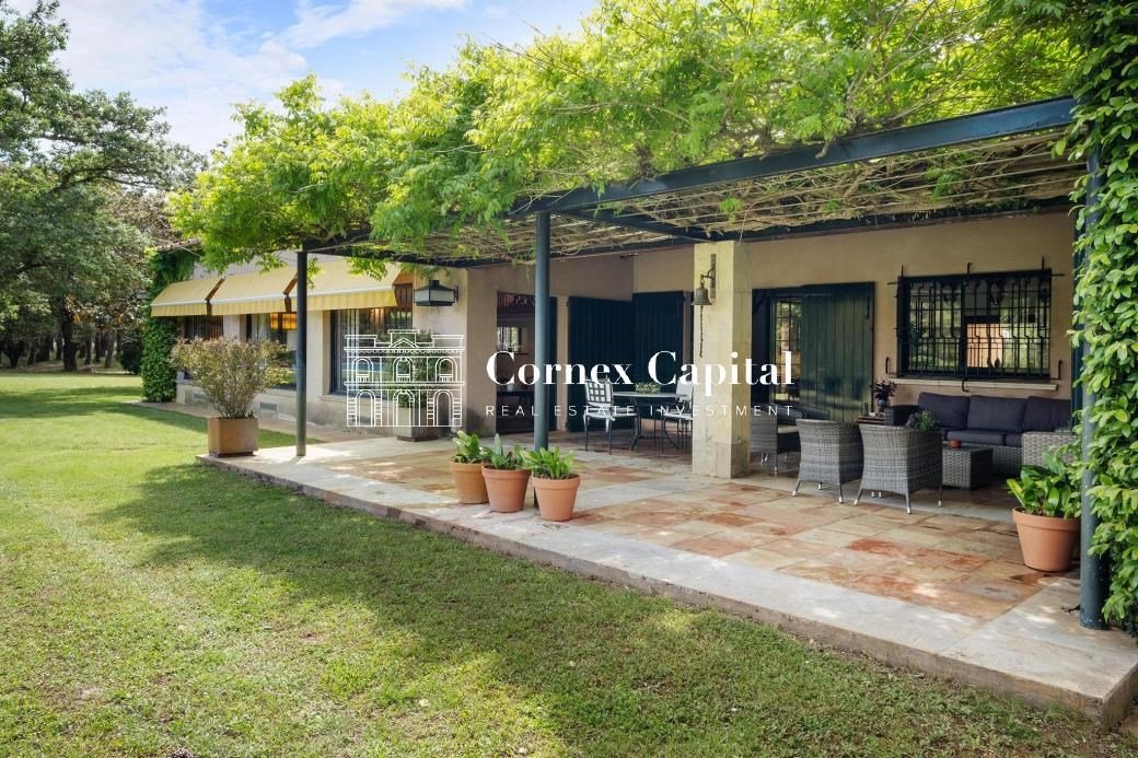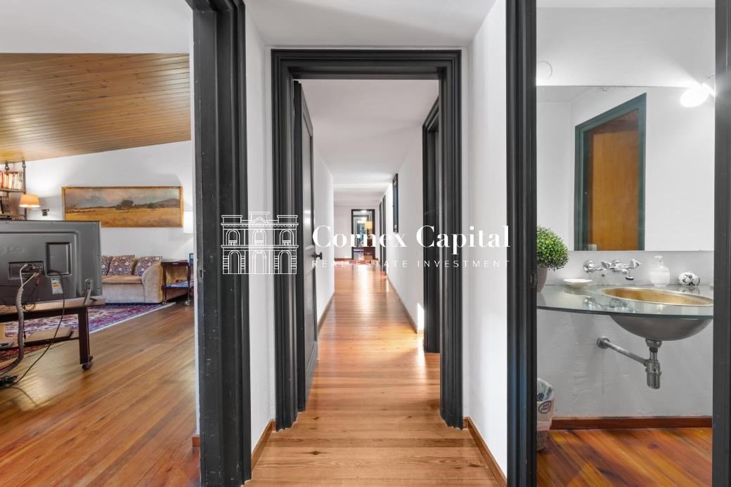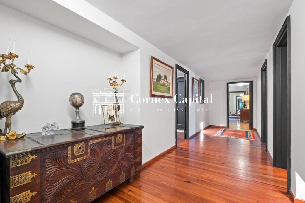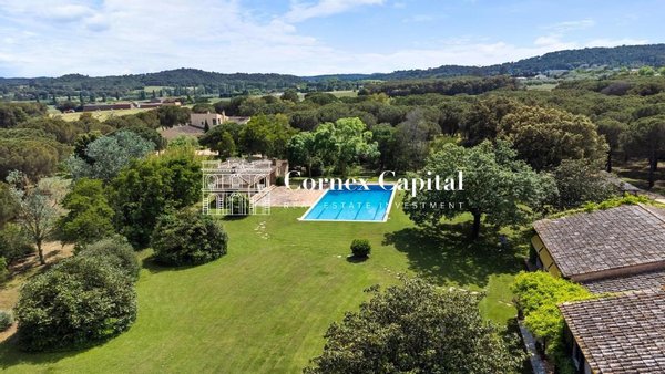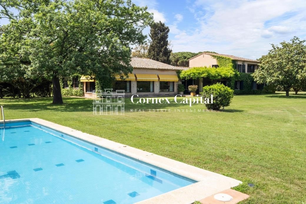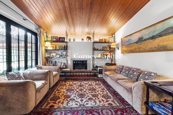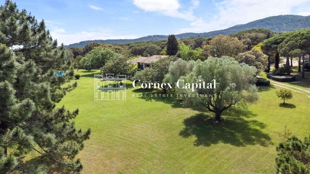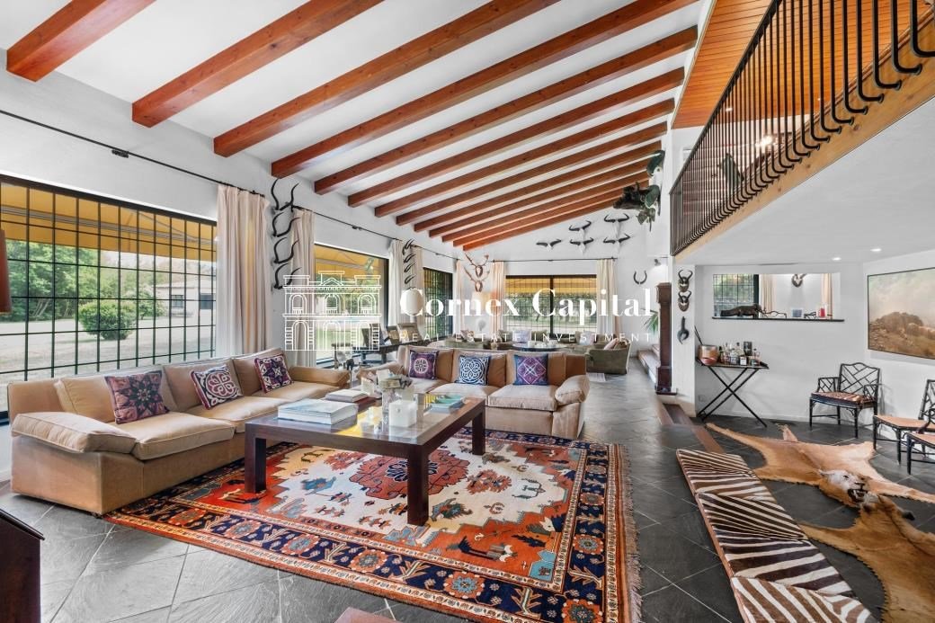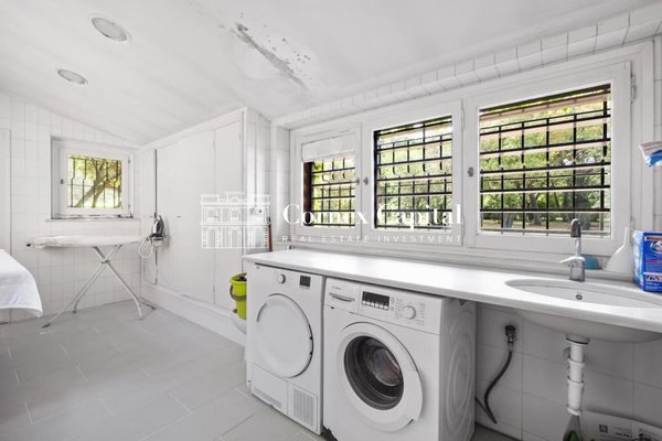 Beim Betreten des Hauses führt ein elegantes Foyer auf eine Terrasse mit Blick auf den Garten- und Poolbereich sowie auf ein Gästebad. Rechts vom Eingang befindet sich eine geräumige Küche mit Essbereich, ein informelles Esszimmer und mehrere Nebenräume: eine Waschküche, ein Personalschlafzimmer mit eigenem Bad, ein zweiter Hauswirtschaftsraum und ein Innenhof. Vom Hauptflur führt eine Treppe in den Weinkeller. Im selben rechten Flügel befindet sich ein gemütliches Wohnzimmer mit Kamin und ein geräumiges und helles Esszimmer.