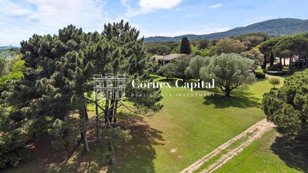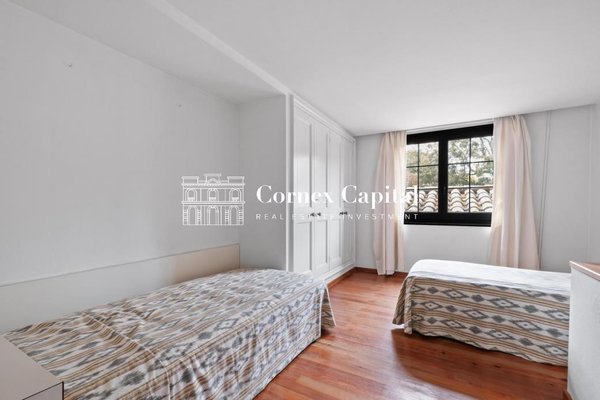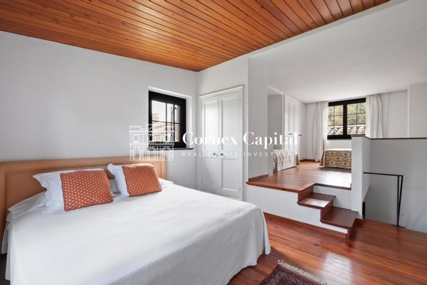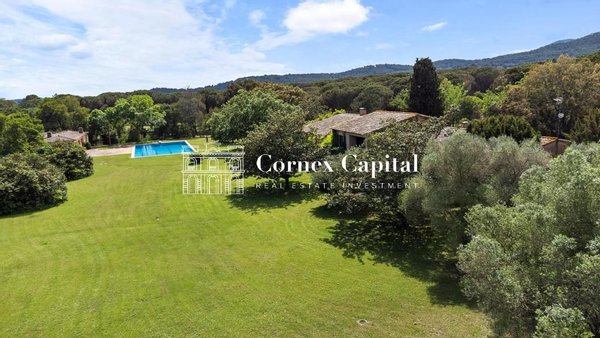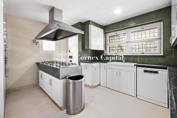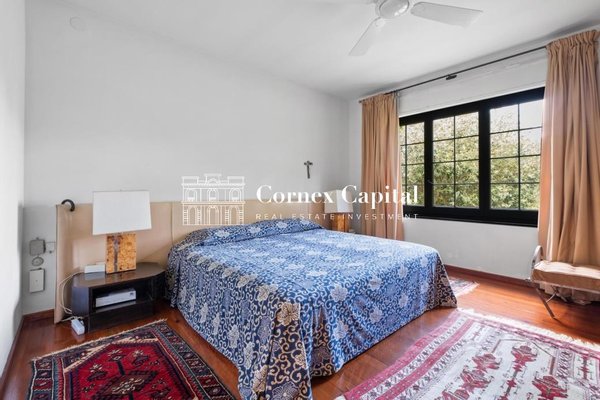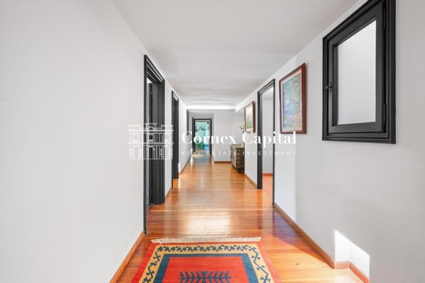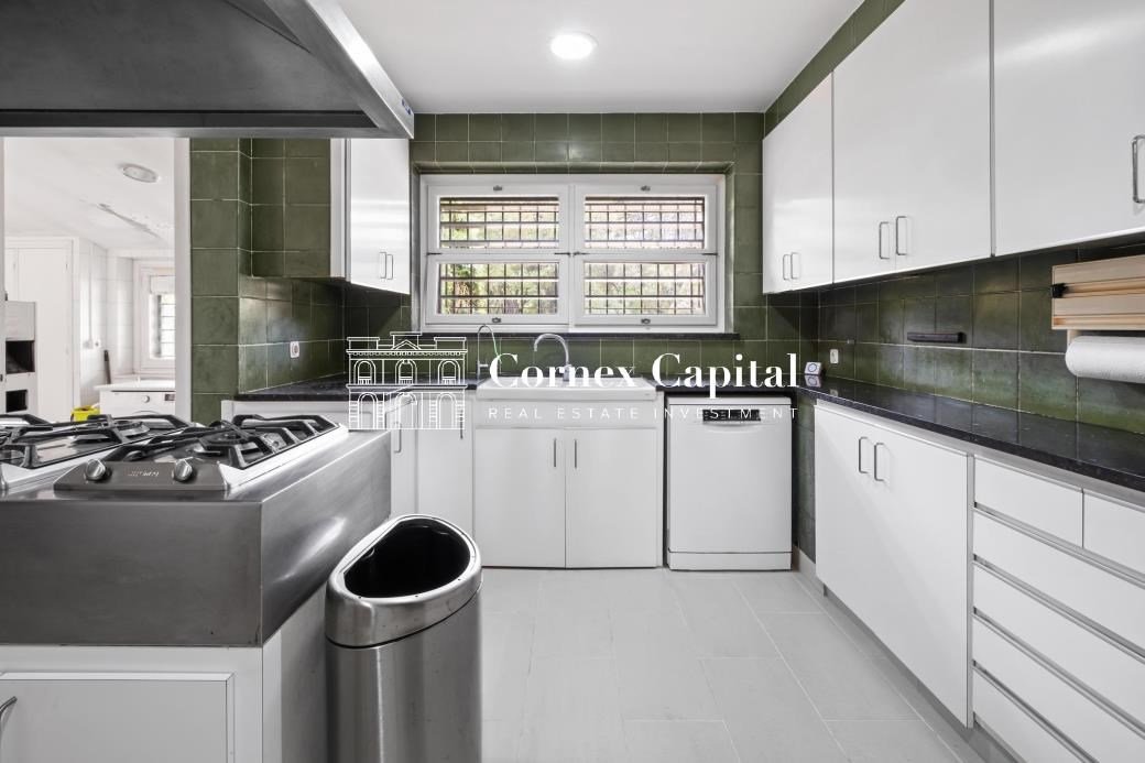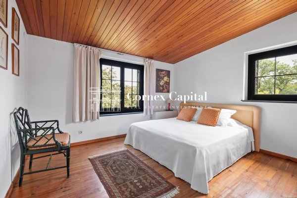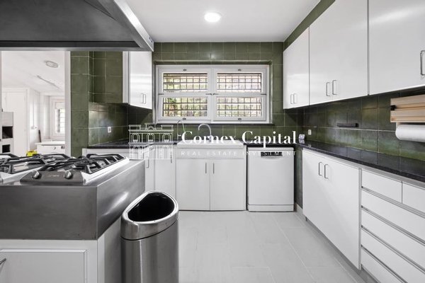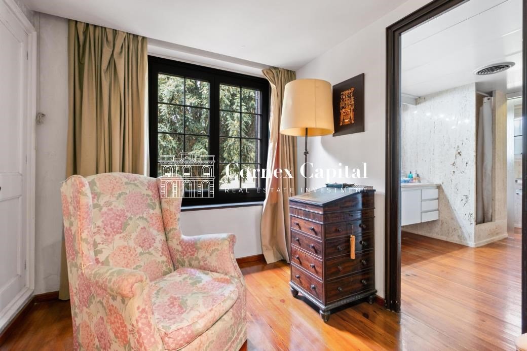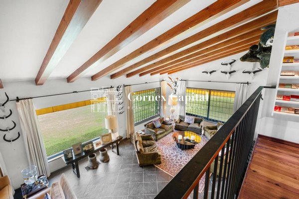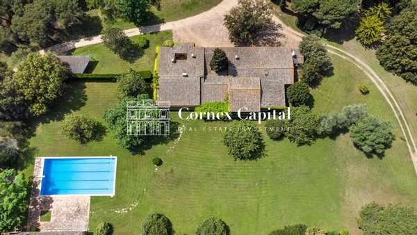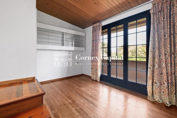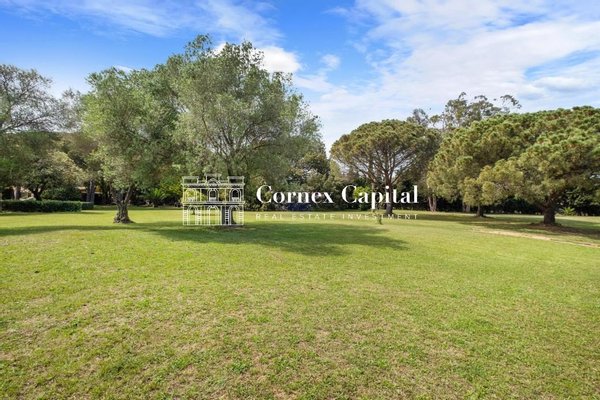Beim Betreten des Hauses führt ein elegantes Foyer auf eine Terrasse mit Blick auf den Garten- und Poolbereich sowie auf ein Gästebad. Rechts vom Eingang befindet sich eine geräumige Küche mit Essbereich, ein informelles Esszimmer und mehrere Nebenräume: eine Waschküche, ein Personalschlafzimmer mit eigenem Bad, ein zweiter Hauswirtschaftsraum und ein Innenhof. Vom Hauptflur führt eine Treppe in den Weinkeller. Im selben rechten Flügel befindet sich ein gemütliches Wohnzimmer mit Kamin und ein geräumiges und helles Esszimmer.