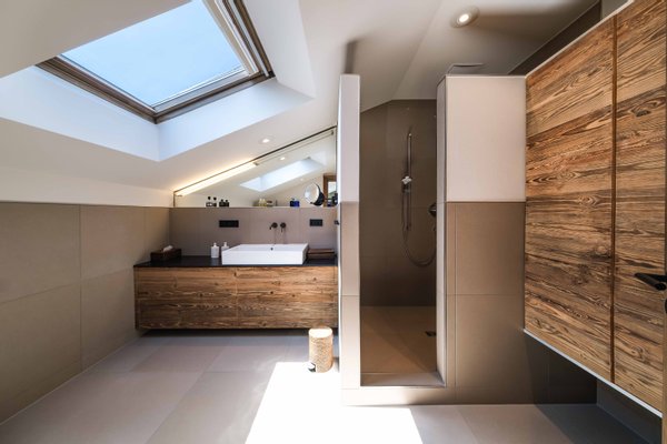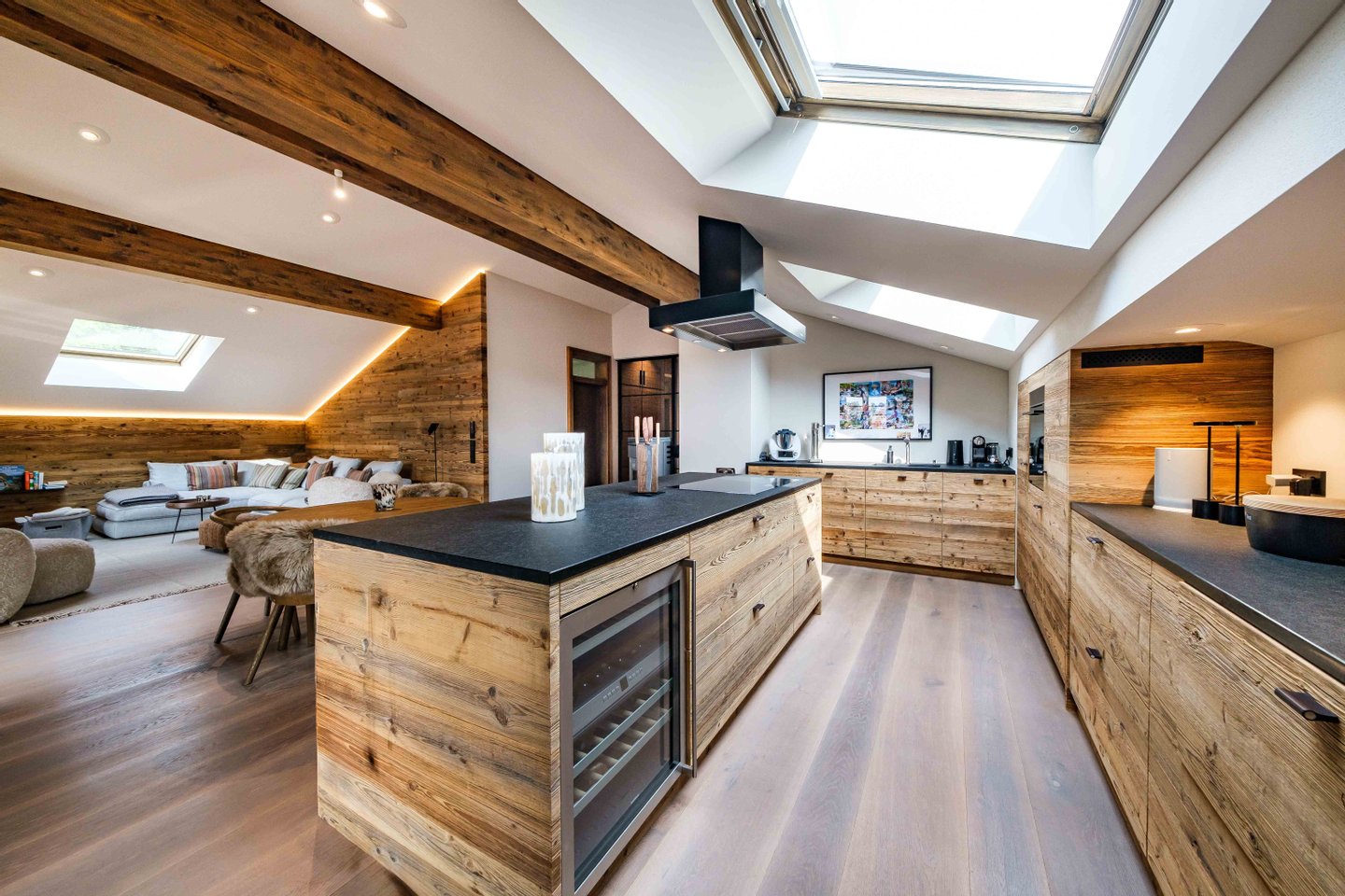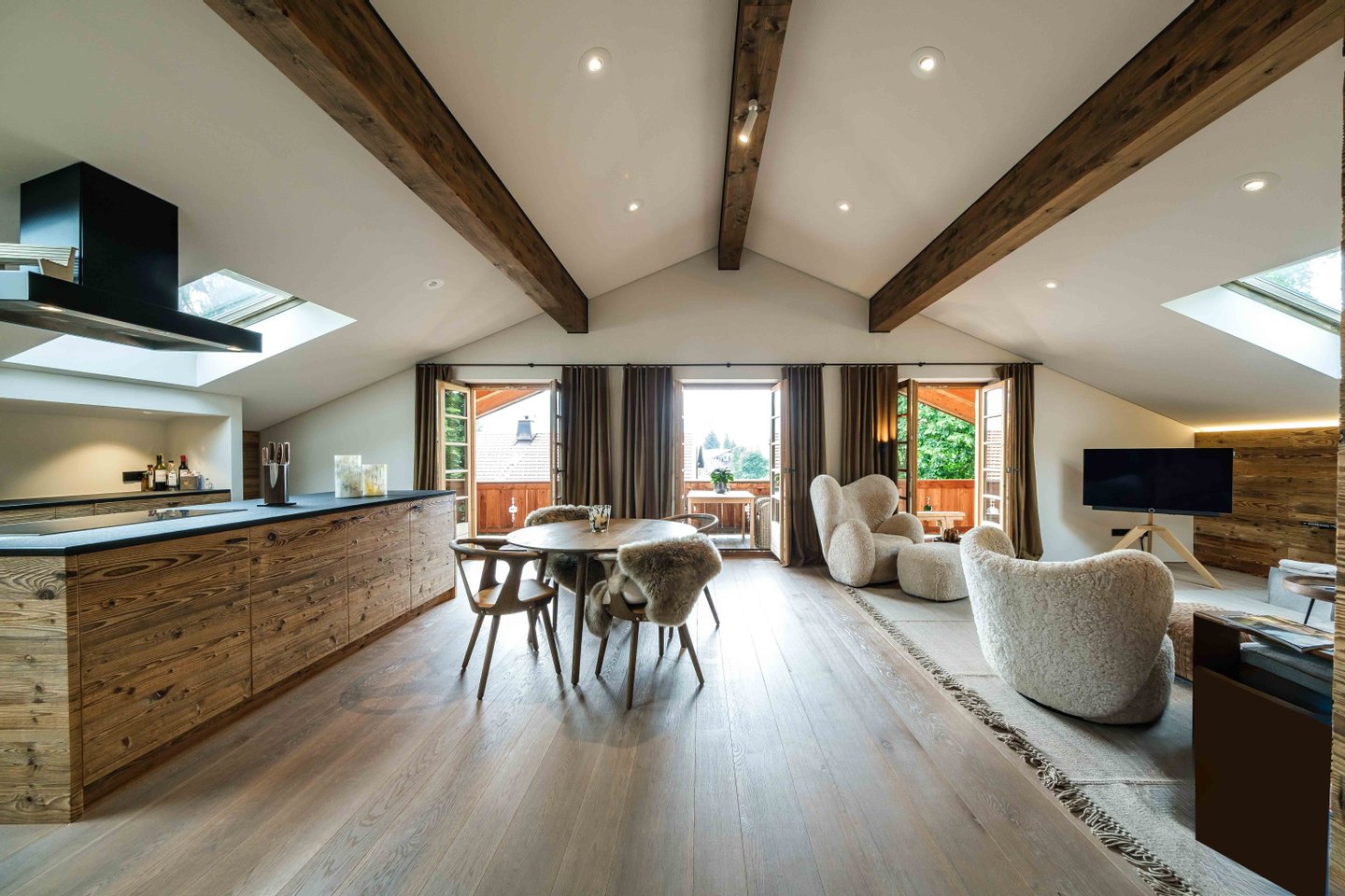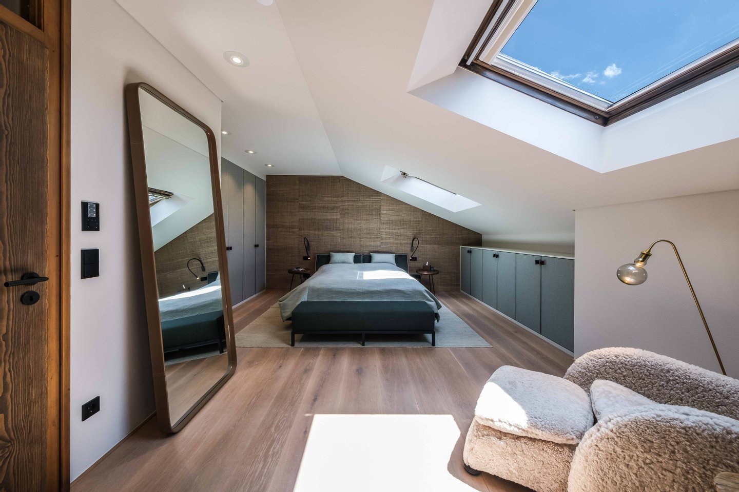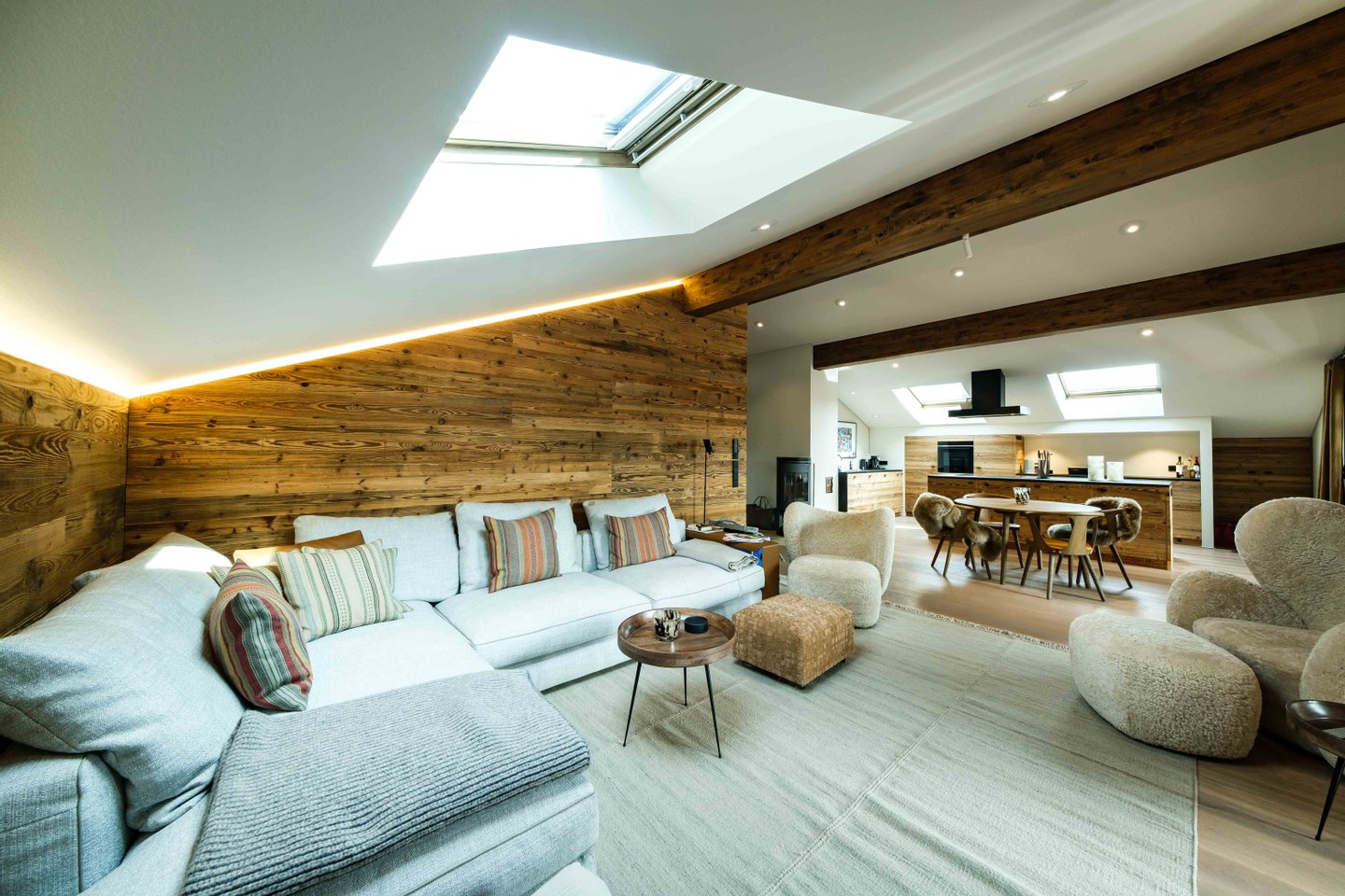 Beleuchtung der Wohnräume, maßgefertigte Einbauten und Türen in sonnenverbranntem Altholz oder lodenbespannte Einbauschränke sind nur einige der vielen Highlights. Das warme Farbkonzept sowie natürliche Materialien lassen in der Wohnung ein sehr hochwertiges und zugleich entspanntes Ambiente entstehen.
