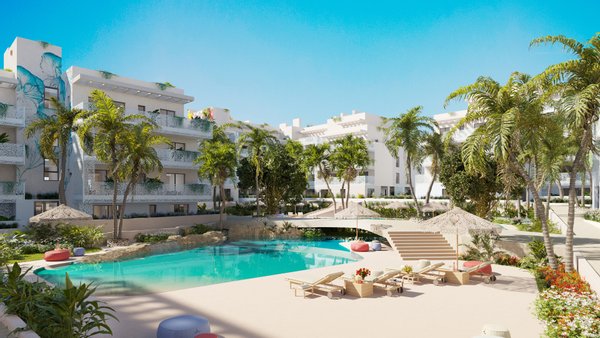 Eine organisch geformte Pool-Landschaft in einer üppig begrünten Außenanlage, ein Rooftop-Gym mit Meerblick, eine gemeinschaftliche Sunset-Dachterrasse sowie eine private Tiefgarage mit zusätzlichen Abstellräumen im Untergeschoss runden das Angebot perfekt ab.
