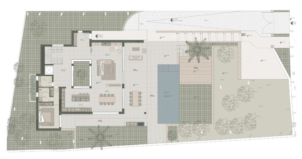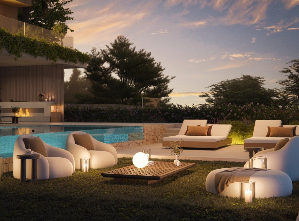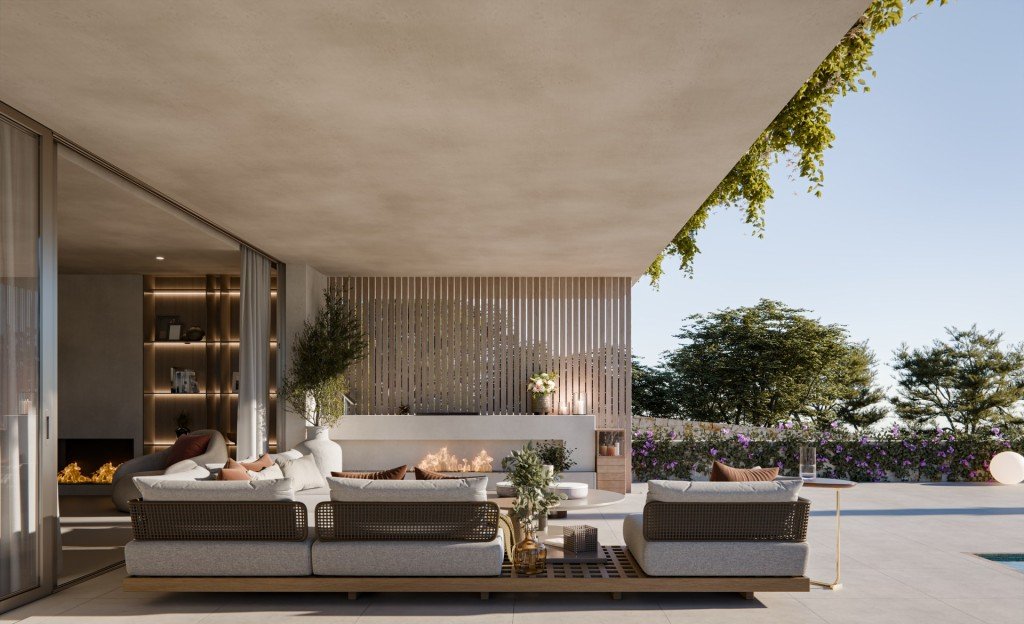 Auch der Außenbereich der Villa ist beeindruckend. Der mediterrane Garten, der das Anwesen umgibt, ist mit einheimischen Pflanzen und Bäumen bestückt und erschafft einen friedlichen Rückzugsort, der zum Entspannen einlädt. Im Freien befindet sich eine Designer-Außenküche mit einer Dexton-Arbeitsplatte, perfekt für ein gemütliches Abendessen im Freien, sowie ein hochmoderner Gasgrill und ein eleganter Gasofen – ideal, um warme Abende mit Familie und Freunden zu genießen. Der große Außenpool ist mit sinterisiertem Stein verkleidet, der mit dem im Haus verwendeten Belag übereinstimmt. Er ist vollständig beleuchtet und mit einem Salzfiltrationssystem ausgestattet, um stets die beste Wasserqualität zu gewährleisten. Zusätzlich verfügt der Pool über ein Heizsystem, das von einer Wärmepumpe betrieben wird und von Photovoltaik-Panels unterstützt wird, sodass eine vollständig erneuerbare Energiequelle garantiert ist. Ein automatisches Abdecksystem wird installiert, um die Wassertemperatur das ganze Jahr über konstant zu halten.