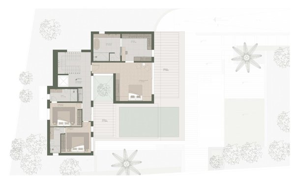 Im ersten Stock verfügt das Hauptschlafzimmer über eine private Terrasse, von der aus man einen Panoramablick auf die Umgebung genießen kann. Außerdem gibt es zwei weitere en-suite Schlafzimmer, die genügend Platz und Privatsphäre für Familie oder Gäste bieten.