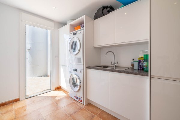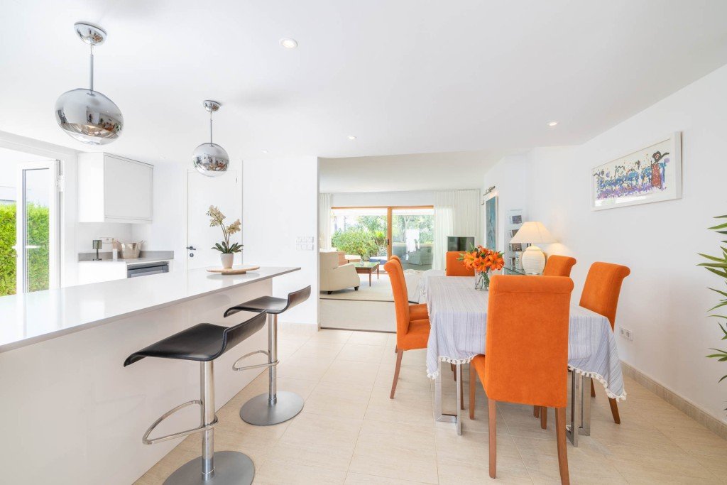 Auf der anderen Seite des Erdgeschosses befinden sich ein Essbereich und eine moderne Einbauküche mit Frühstücksbar und Weinkühlschrank, ebenfalls mit Zugang zu zwei weiteren Terrassen, darunter eine mit einem großen Webber-Grill und elektrischer Markise. Auf dieser Ebene befinden sich auch ein Gästebad und ein Wasch- und Hauswirtschaftsraum, der über den Patio erreicht werden kann.