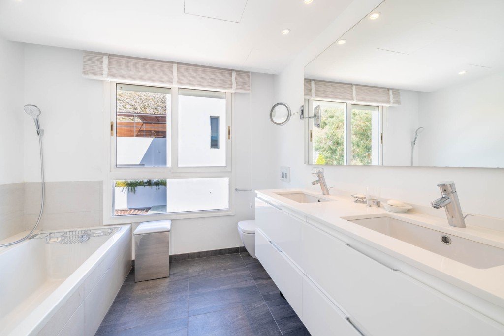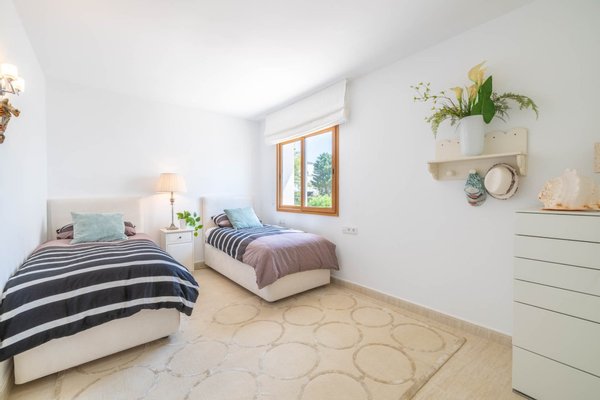 Im ersten Stock befinden sich insgesamt drei Schlafzimmer und zwei Bäder, die sich wie folgt verteilen: Ein Schlafzimmer mit grossem Doppelbett, eigenem Bad, begehbarem Kleiderschrank und einer privaten Terrasse mit Blick auf den Pool. Es gibt auch ein Schlafzimmer mit Doppelbett und ein Zweibettzimmer, die sich ein Badezimmer teilen.