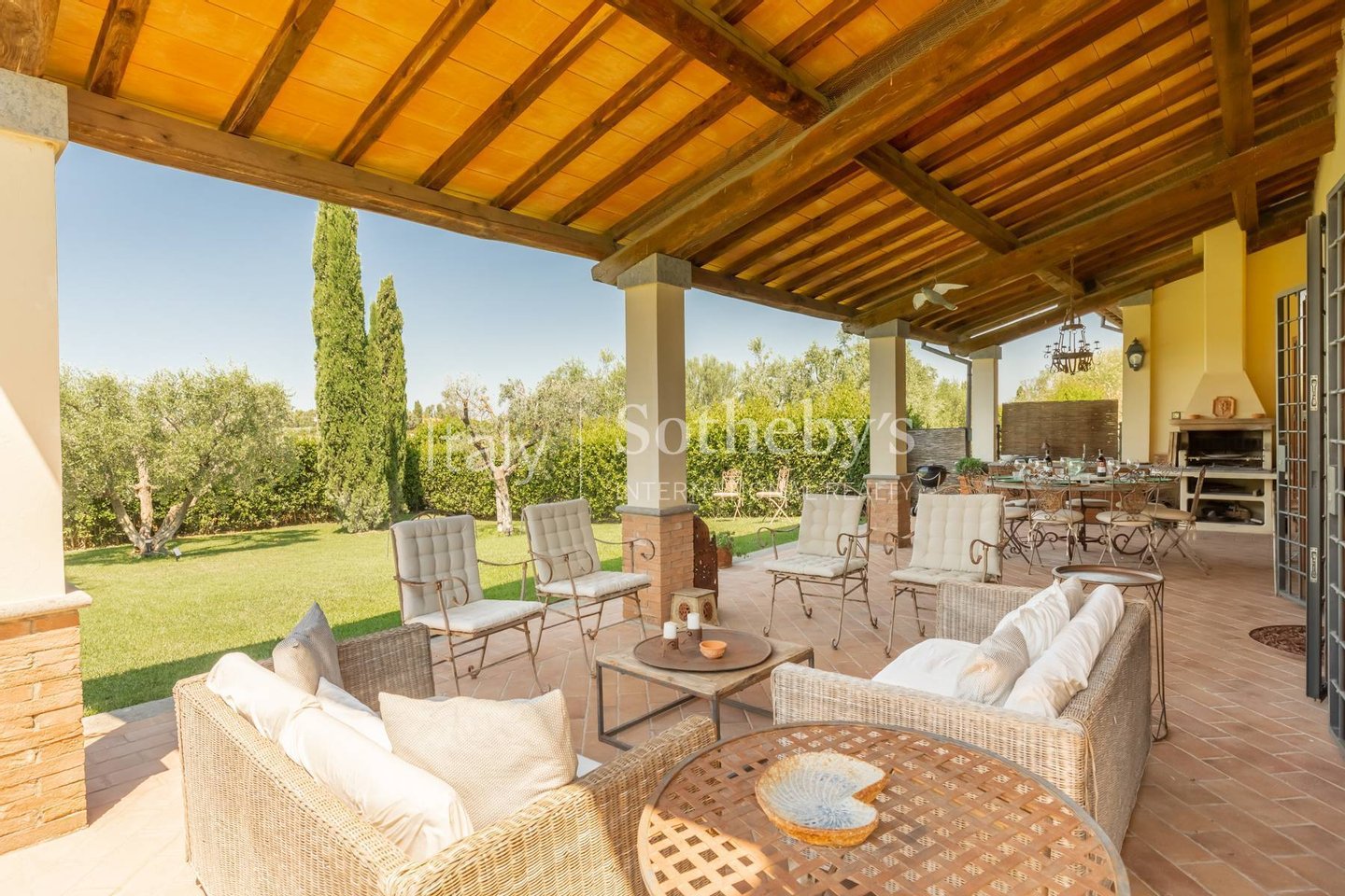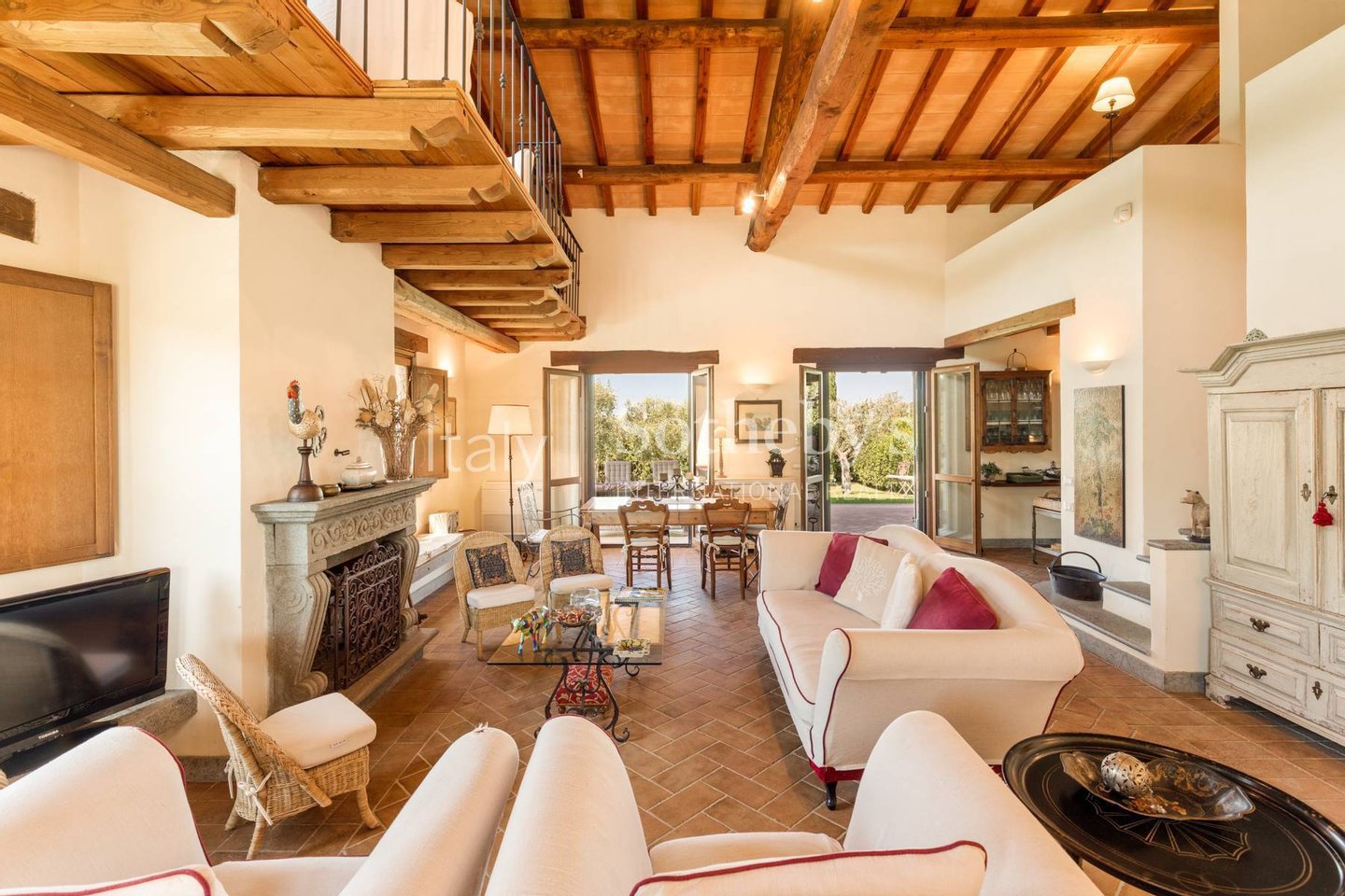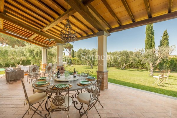 Die weitläufigen Außenbereiche bieten zwei überdachte Terrassen mit Sofas und einem Esstisch - perfekt für Abendessen im Freien bei Sonnenuntergang. Der umliegende Privatgarten mit Rasenflächen und Olivenbäumen verleiht dem Anwesen ein natürliches, friedliches Flair, während der herrliche Pool der ideale Ort ist, um sich an sonnigen Tagen zu erfrischen und zu entspannen.