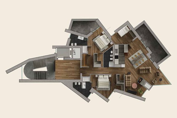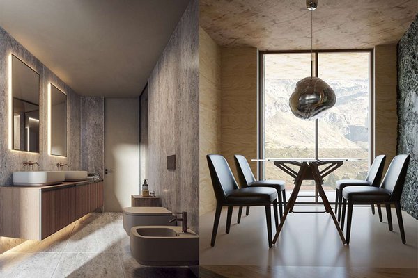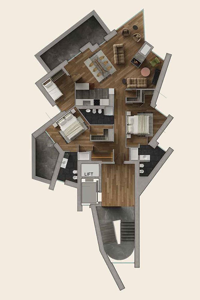 Durch natürliche Materialien, klare Linien und akribische Liebe zum Detail definiert dieses Projekt die urbane Qualität von Cervinia neu – es ruft das Erbe der alpinen Architekturmeister des 20. Jahrhunderts hervor. Maßgeschneiderte Eleganz Jede der acht exklusiven Wohnhäuser bietet 197 m² anpassbare Wohnfläche.
